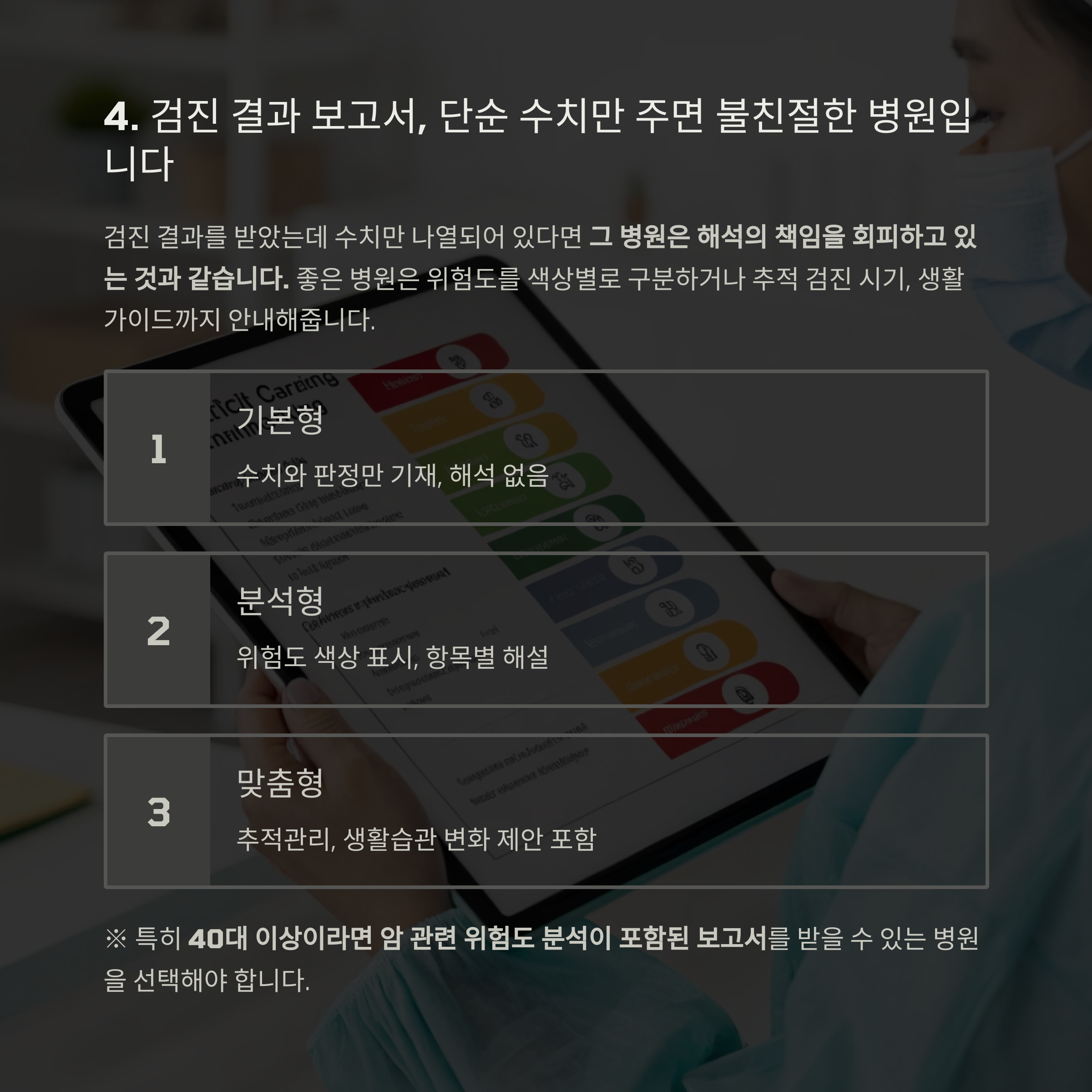 ※ 특히 40대 이상이라면 암 관련 위험도 분석이 포함된 보고서를 받을 수 있는 병원을 선택해야 합니다.
