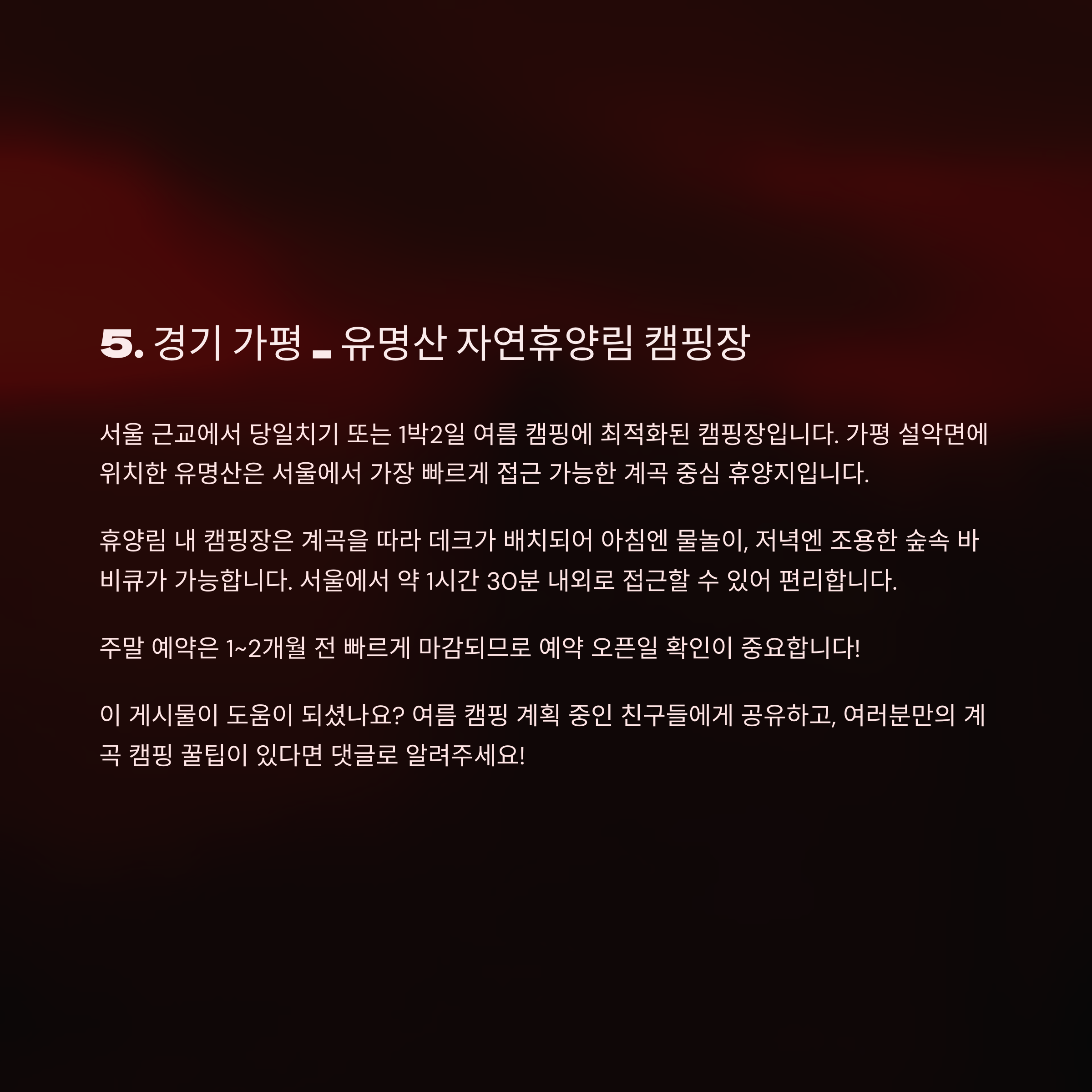 서울 근교부터 한적한 산골까지, 여름에 딱 맞는 계곡 옆 캠핑장은 어디일까요?