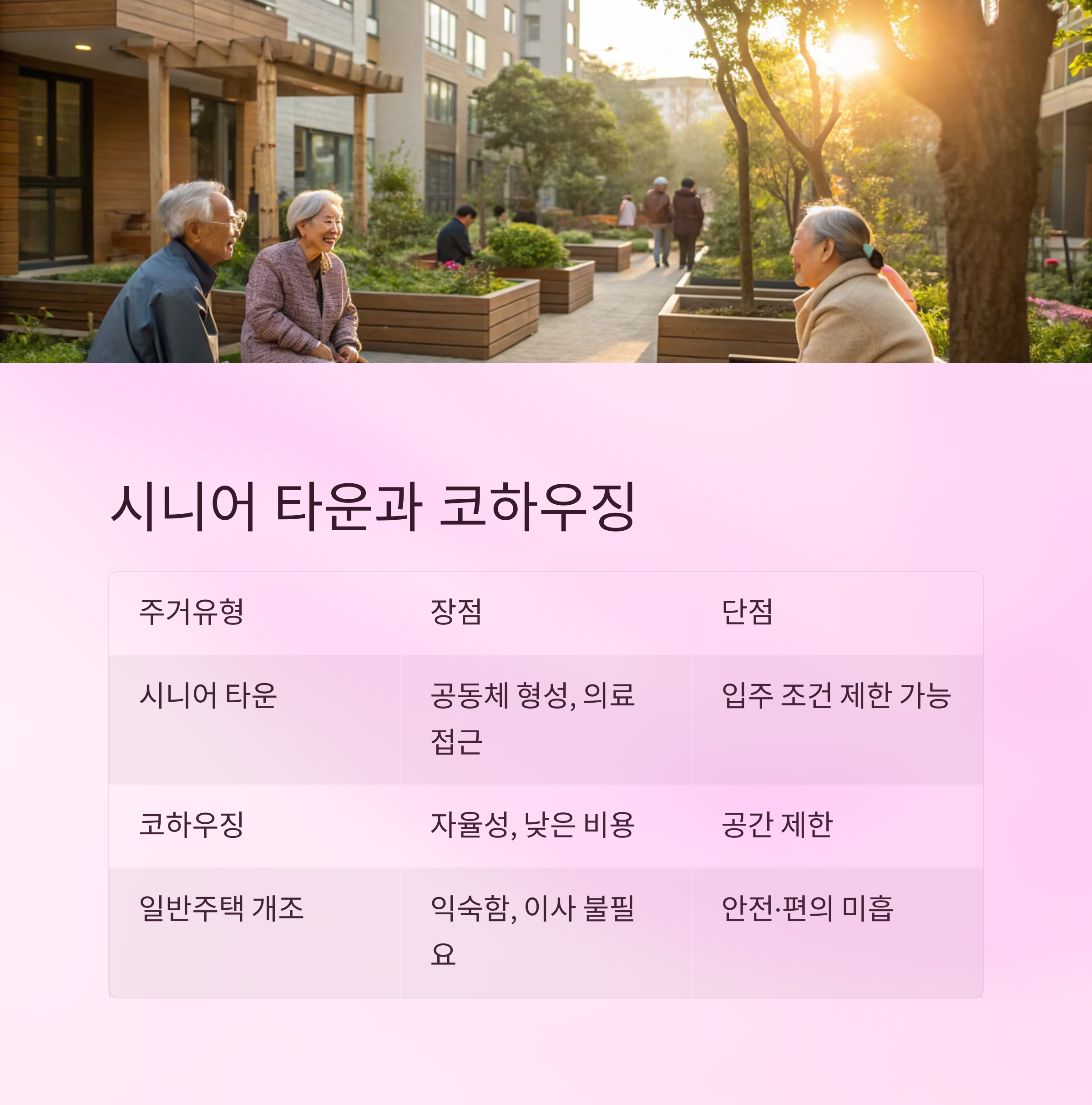| 시니어 타운 | 공동체 형성, 의료접근 | 입주 조건 제한 가능 |
