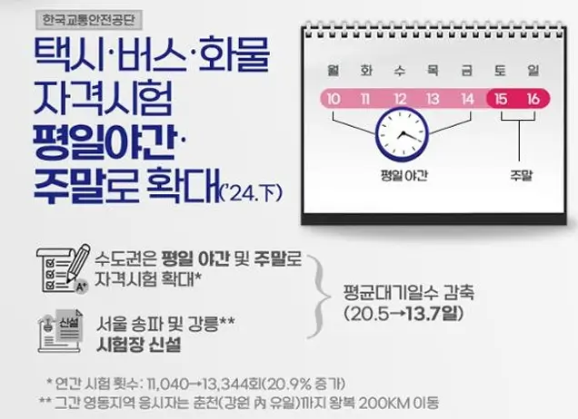 택시, 버스, 화물 자격시험의 응시자가 증가하면서 대기 시간이 길어졌습니다. 이를 해결하기 위해 평일 야간 및 주말에도 자격시험이 실시됩니다.