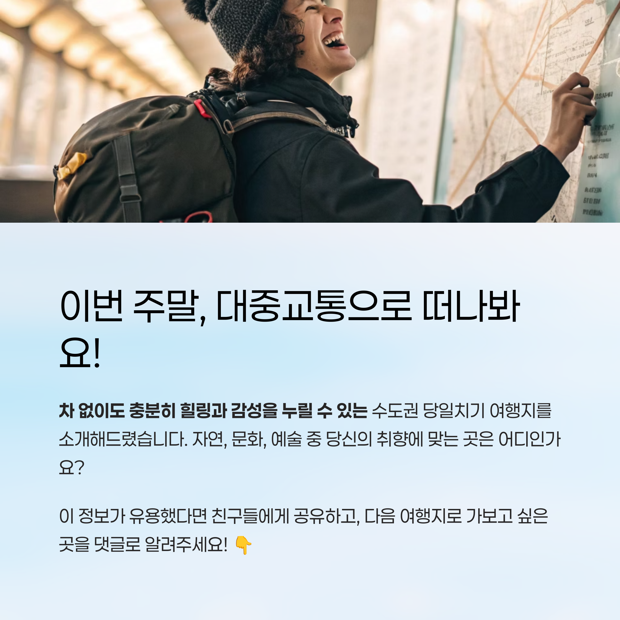자동차 없이도 쉽게 갈 수 있는 수도권 근교 여행지를 소개하며,