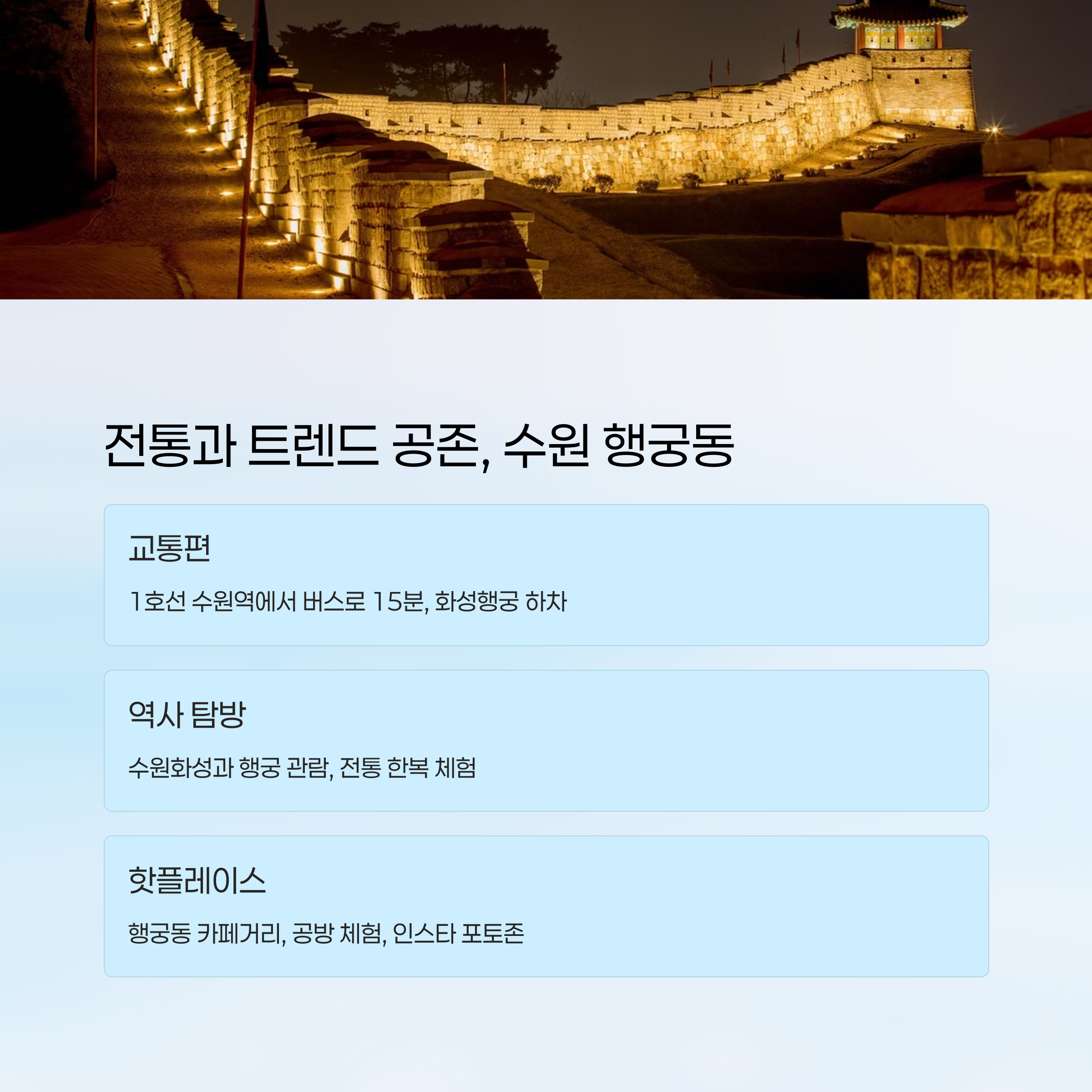 | 수원 | 행궁동, 화성행궁 | 전철 + 도보 | 역사와 산책 |