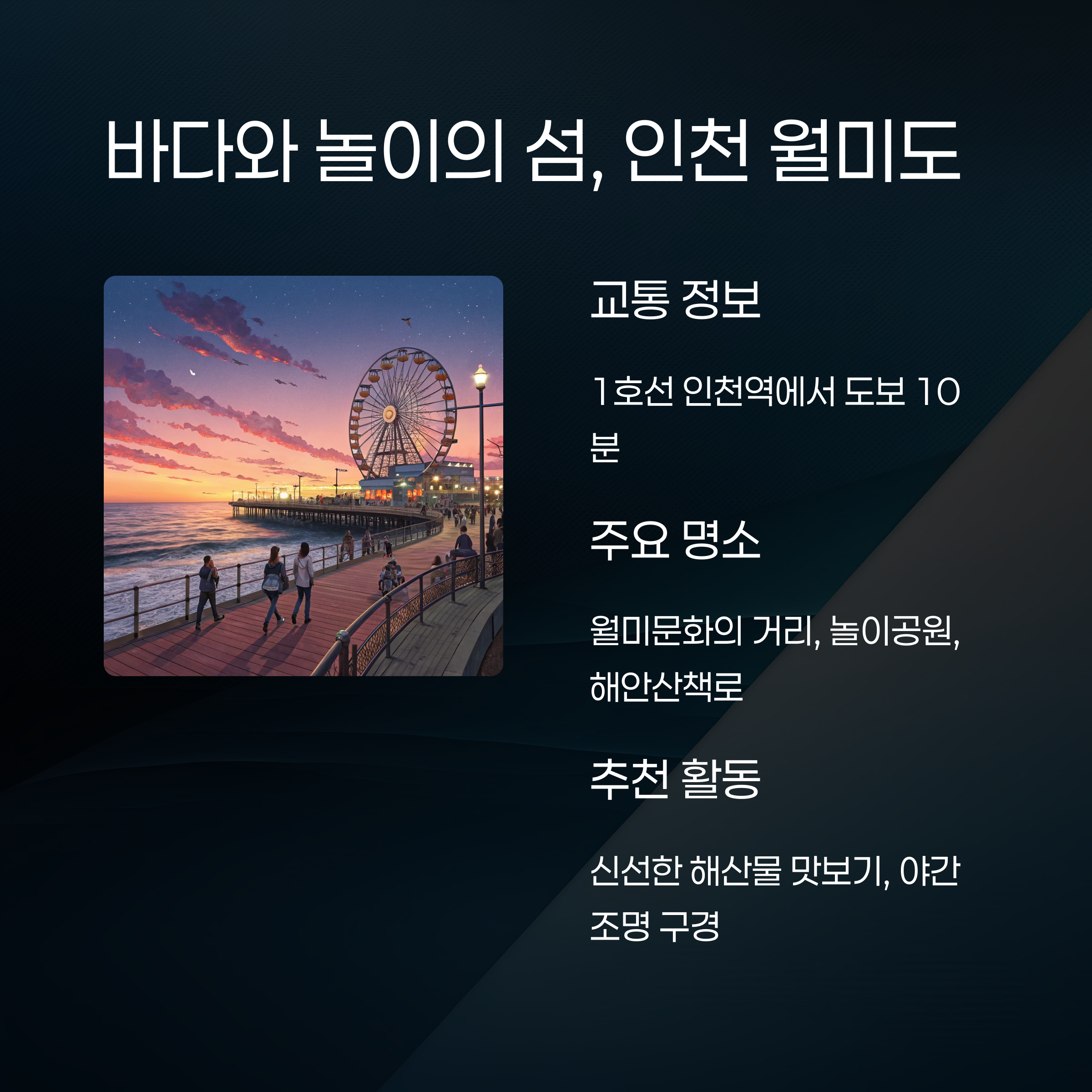 | 인천 | 월미도 해양공원 | 지하철 1호선 | 바다와 먹거리 |