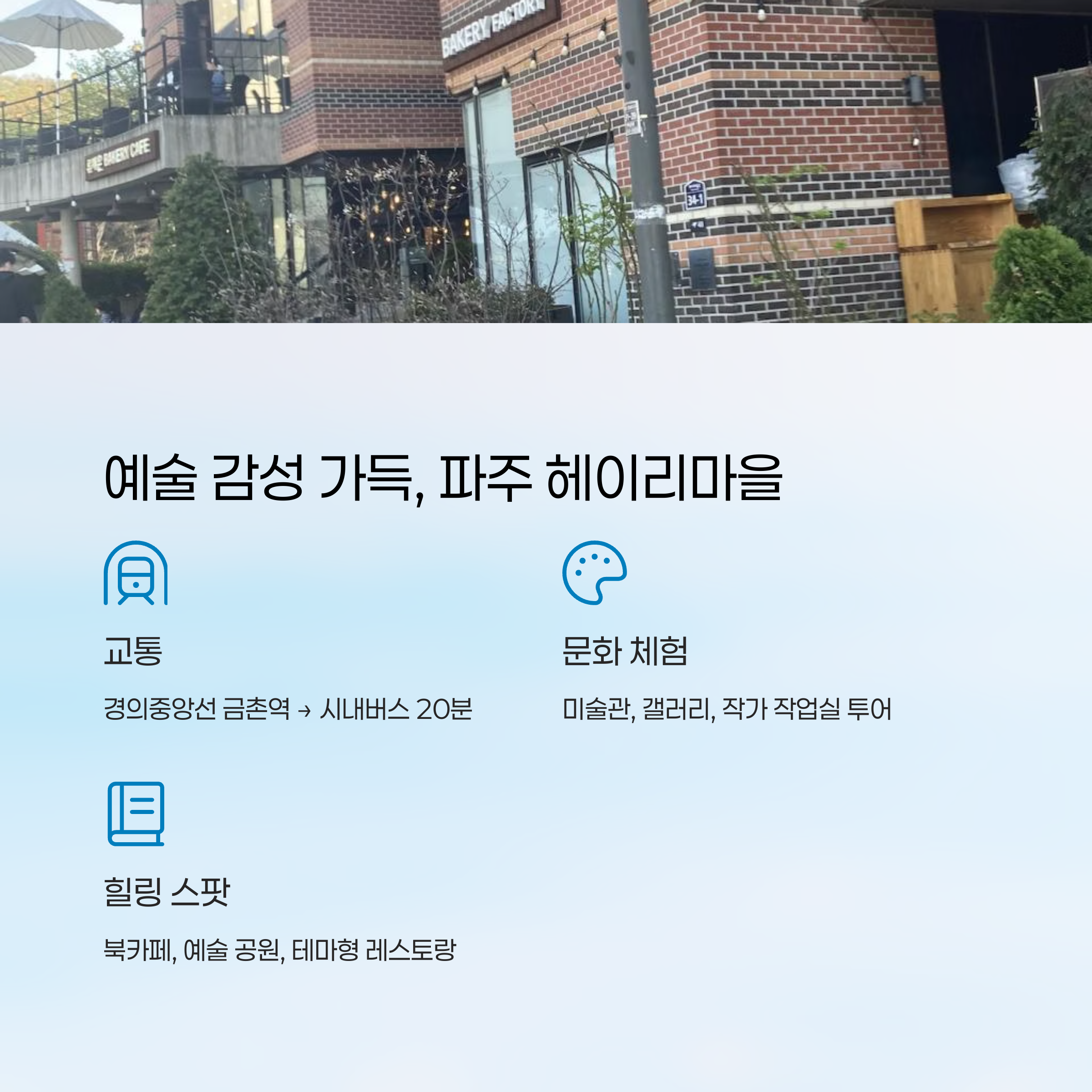 | 파주 | 헤이리 예술마을 | 경의중앙선 + 버스 | 예술과 감성 |