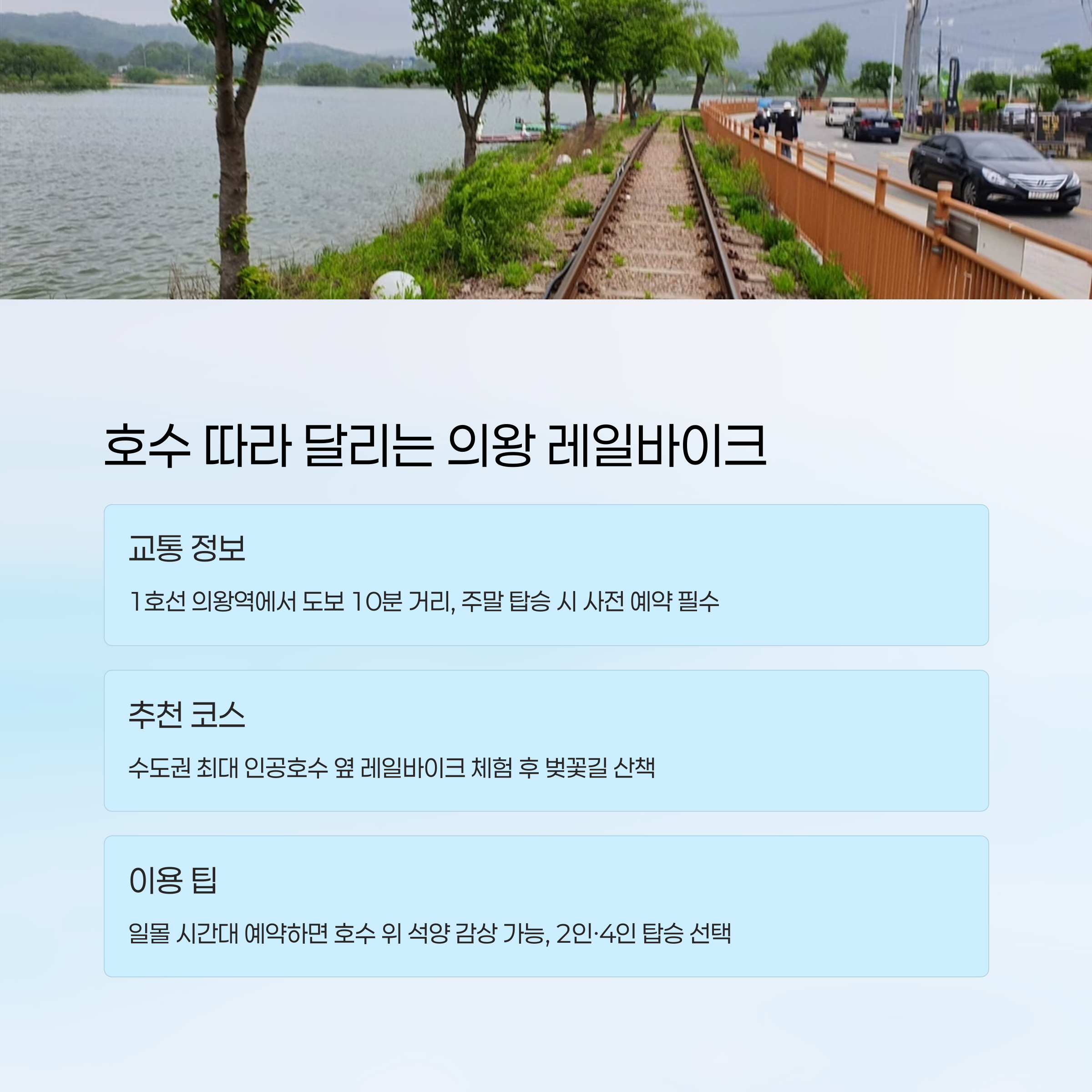 | 의왕 | 왕송호수 레일바이크 | 전철 1호선 | 자연 속 레저 |