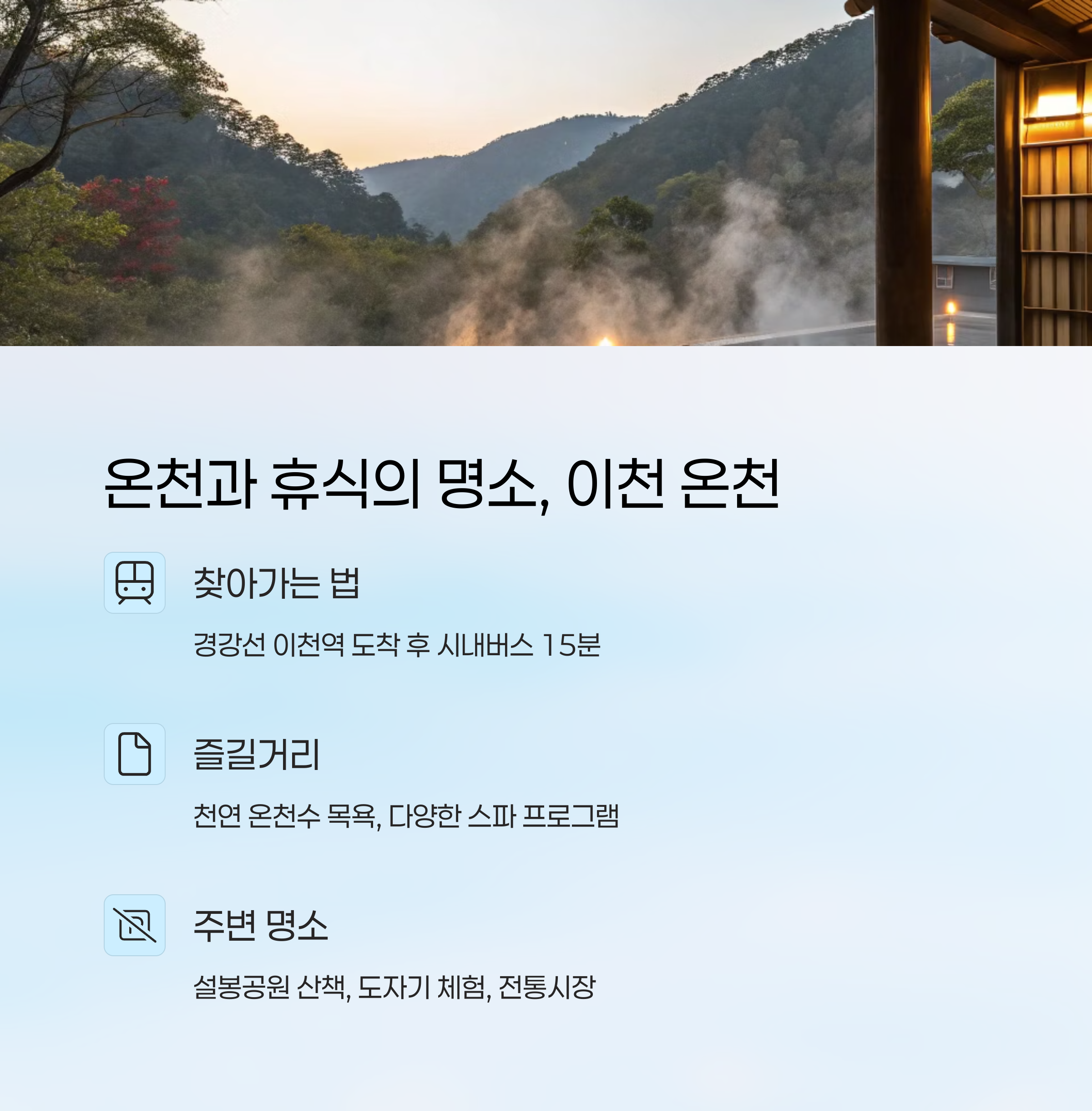 | 이천 | 테르메덴, 설봉공원 | 고속버스 + 셔틀 | 온천과 자연 |