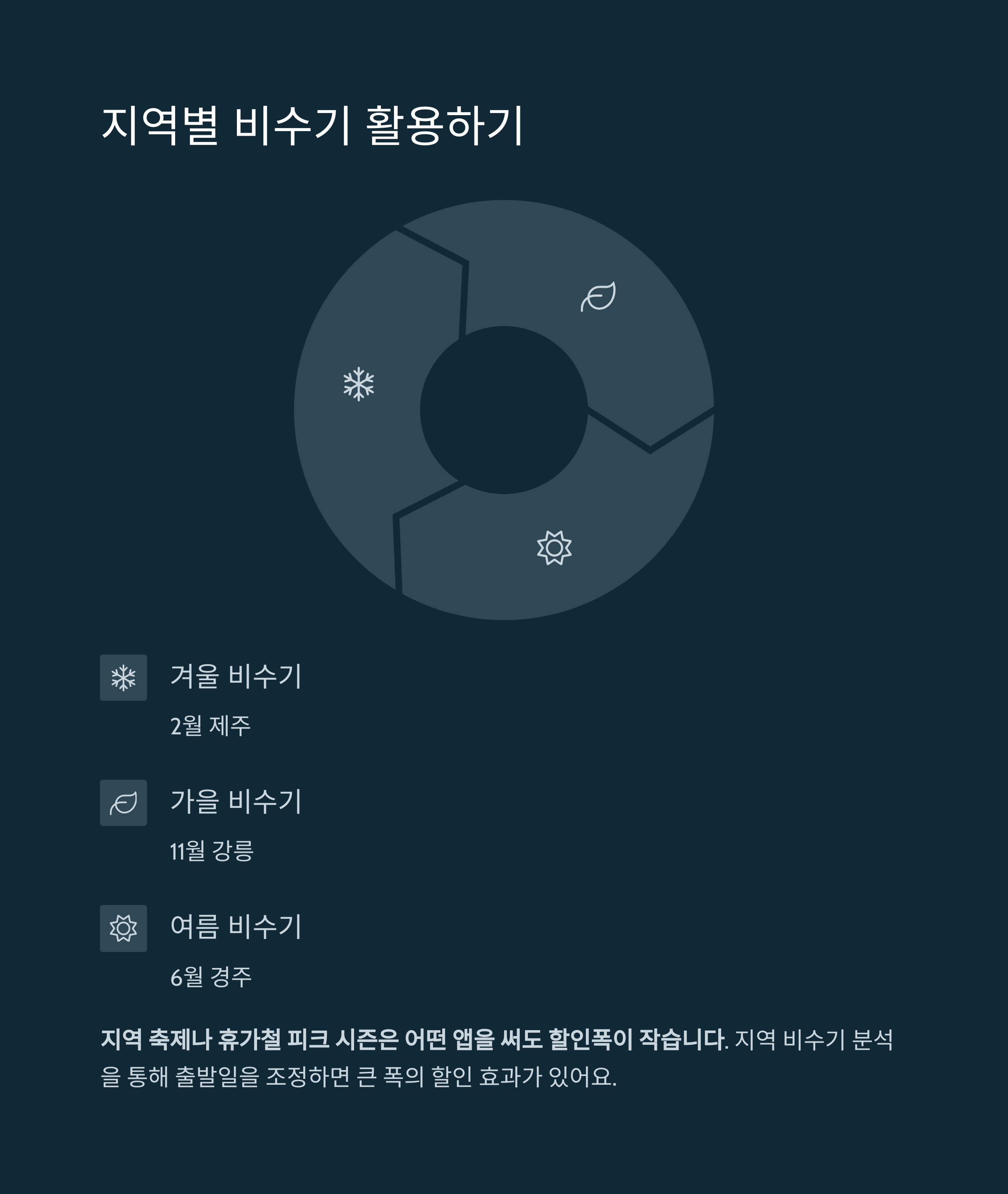 지역 축제나 휴가철 피크 시즌은 어떤 앱을 써도 할인폭이 작습니다