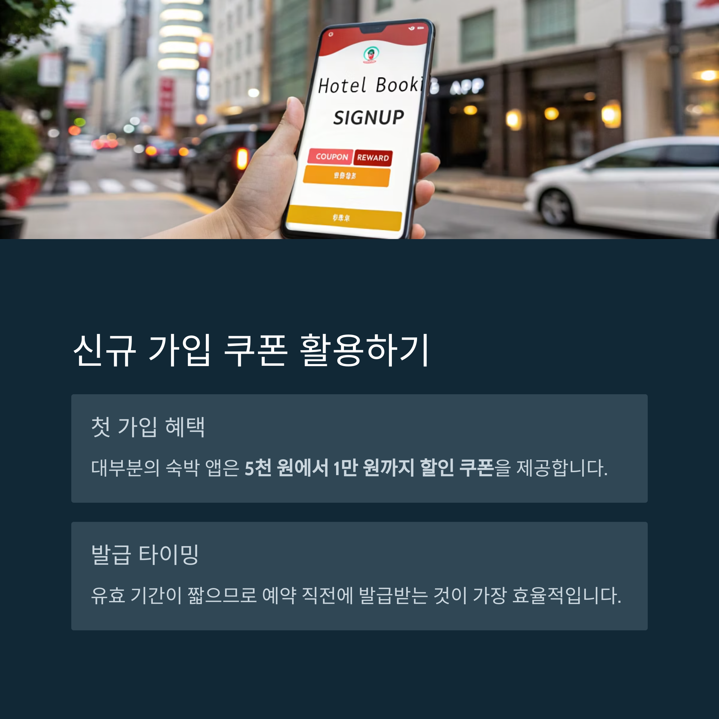 대부분의 숙박 앱은 첫 가입 시 5천 원에서 1만 원까지 할인 쿠폰을 제공합니다