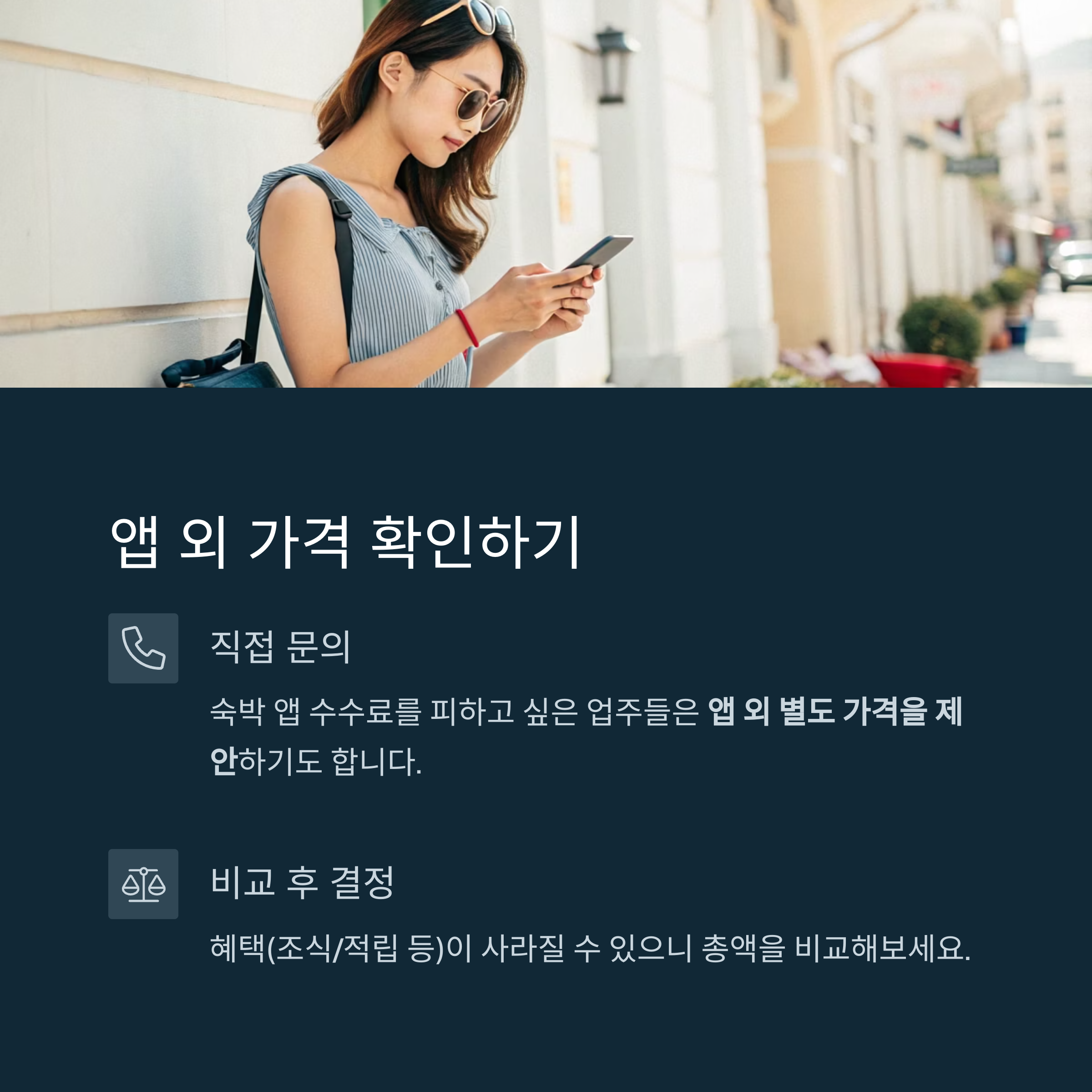 숙박 앱 수수료를 피하고 싶은 업주들은 앱 외 별도 가격을 제안하기도 합니다