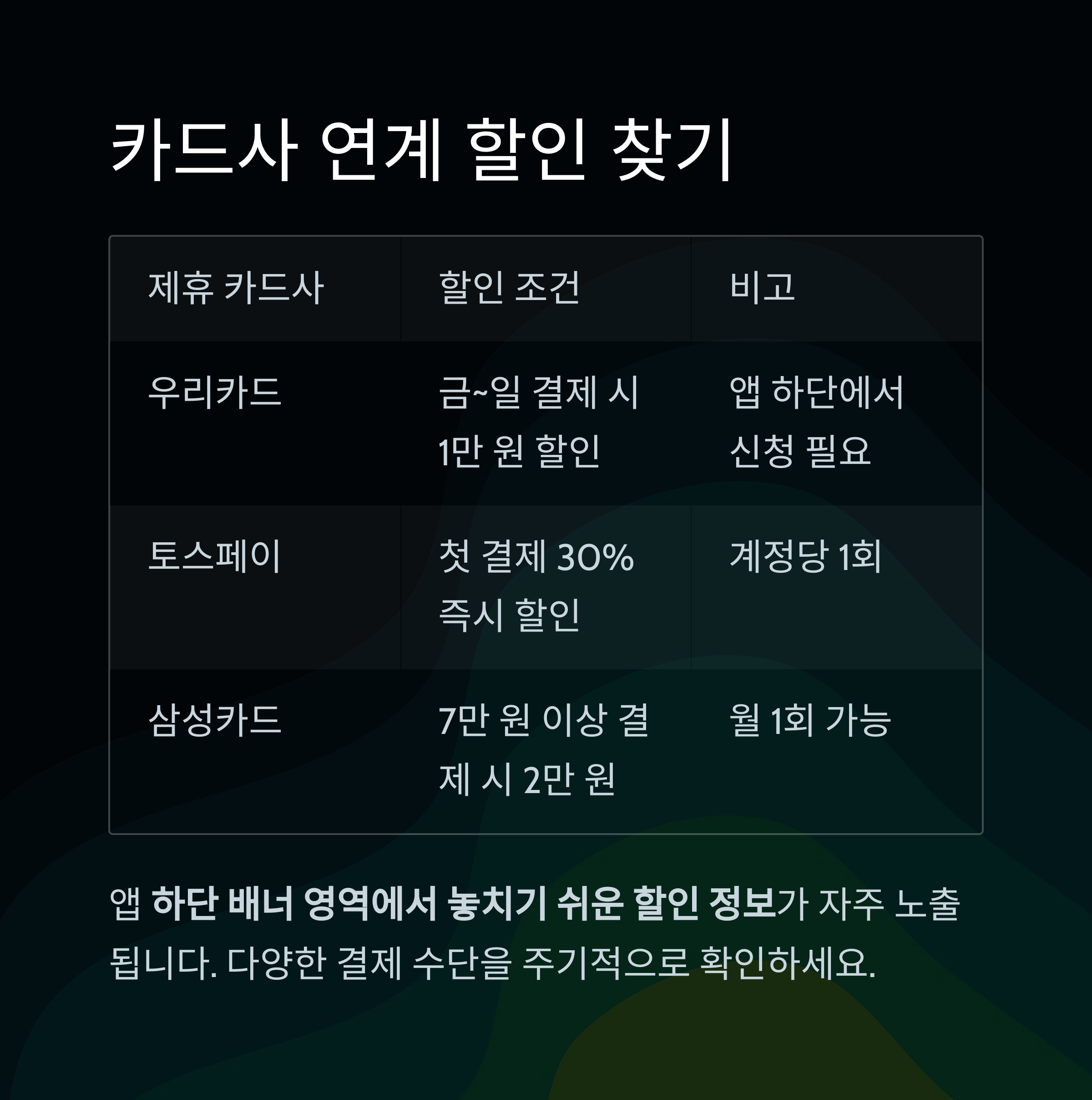 | 우리카드 | 금~일 결제 시 1만 원 할인 | 앱 하단에서 신청 필요 |