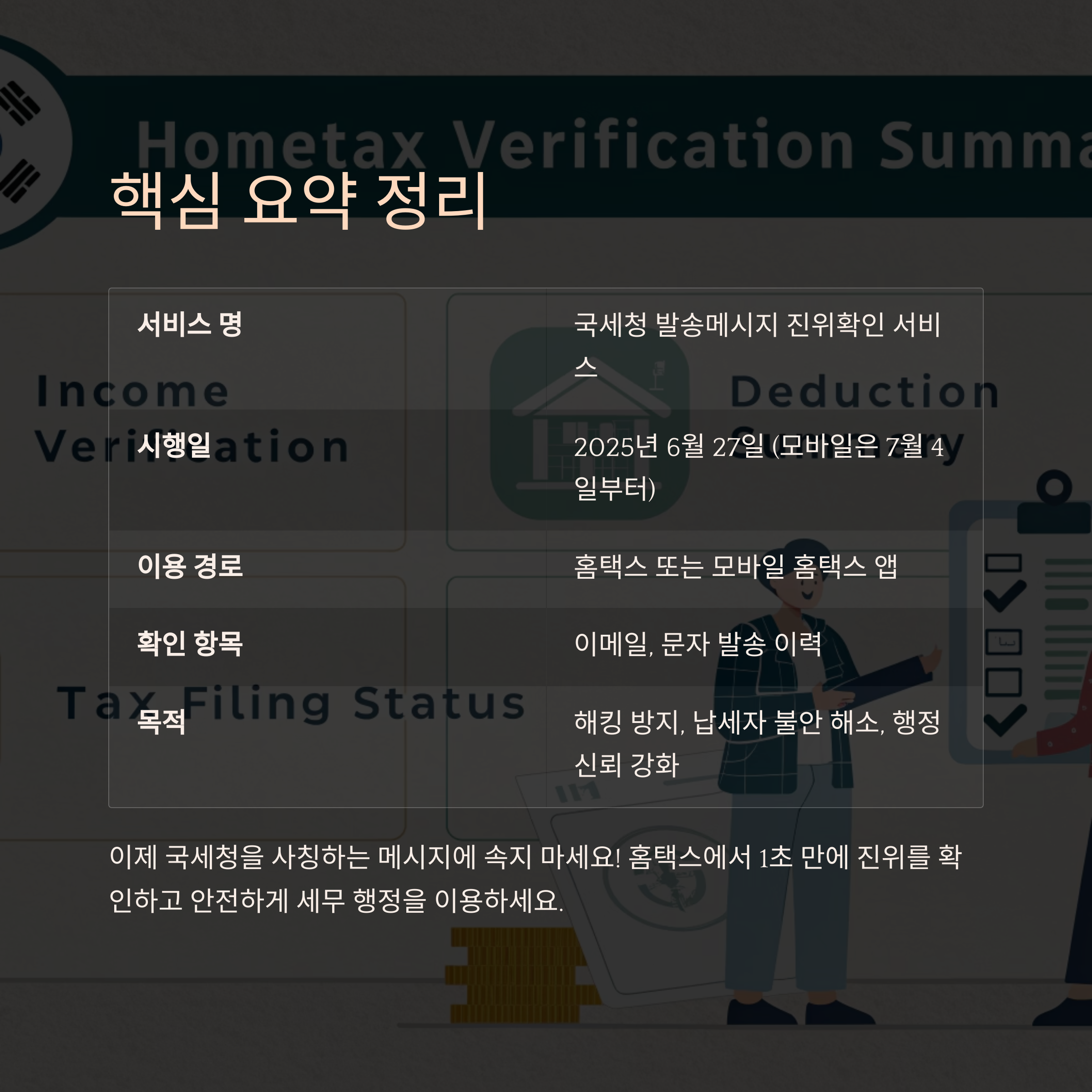 2025년 6월 27일부터 국세청이 ‘국세청 발송메시지 진위확인 서비스’를 홈택스를 통해 정식 오픈했습니다. 국민이 받는 메일이나 문자 메시지가 실제 국세청에서 보낸 것인지 즉시 확인할 수 있는 기능으로, 사이버 범죄 예방과 개인정보 보호 차원에서 큰 진전을 이룬 보안 정책입니다. 특히 최근 AI 기술까지 악용한 정교한 피싱 수법이 증가하면서, 이번 진위확인 서비스는 납세자 보호에 실질적인 도움이 될 것으로 기대됩니다.
