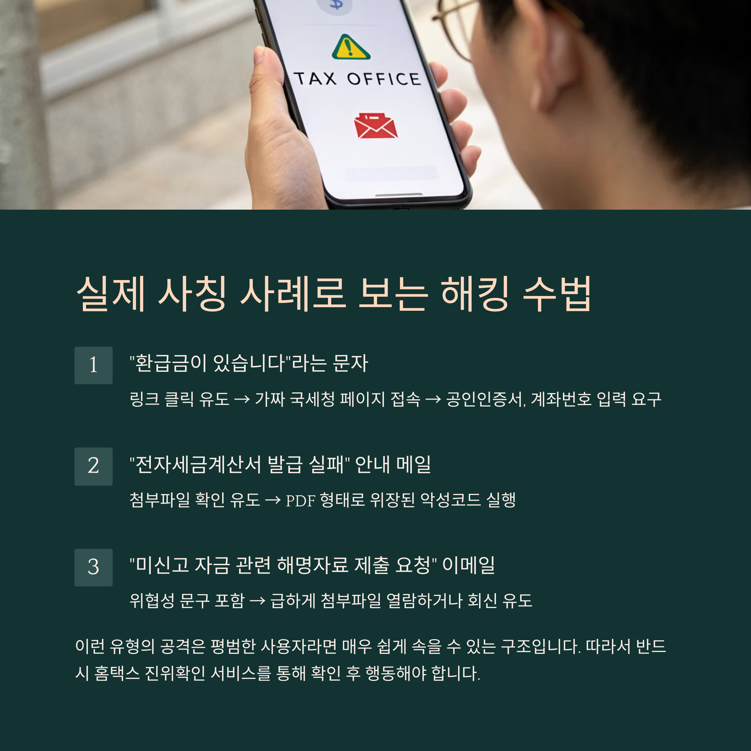 소득세 환급, 전자세금계산서 안내… 국세청 사칭 해킹 메시지, 이제 더는 속지 마세요