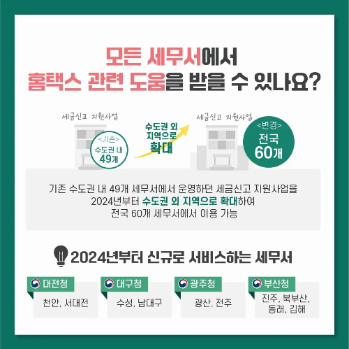 - 2024년부터 수도권 외 60개 세무서에서 이 서비스를 사용할 수 있습니다. 신규 서비스 제공 세무서는 다음과 같습니다: