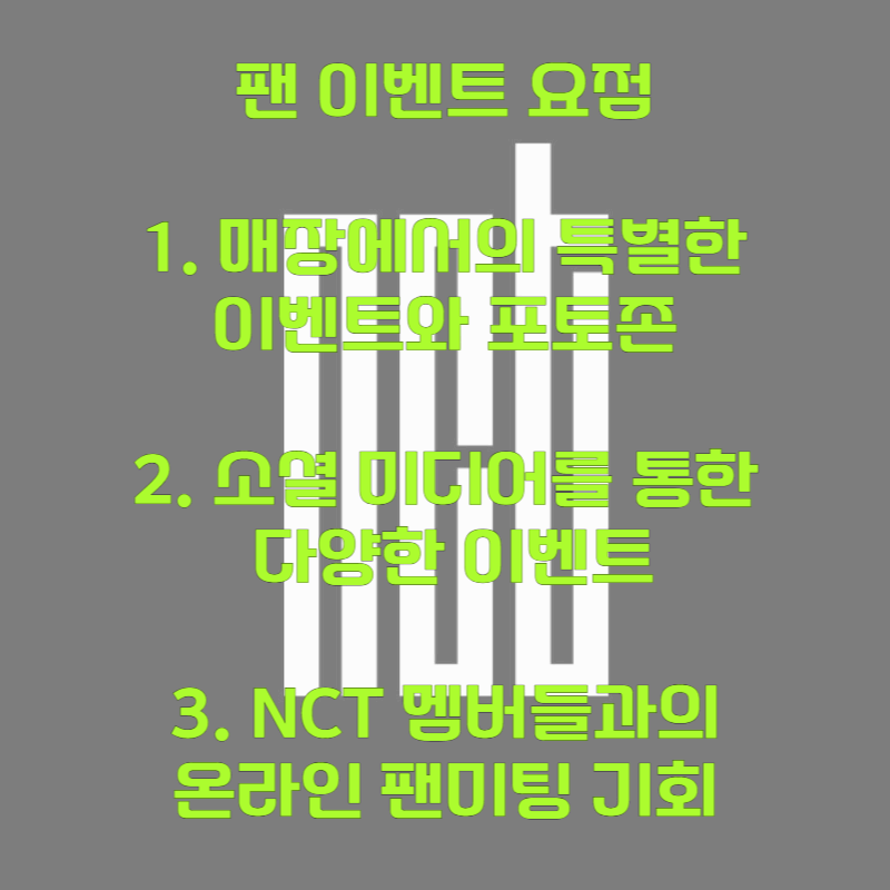 스타벅스는 이번 콜라보를 기념하여 다양한 팬 이벤트를 준비했습니다. 팬들은 스타벅스 매장에서 NCT 관련 이벤트에 참여할 수 있으며, 소셜 미디어를 통해서도 다양한 이벤트가 진행됩니다.