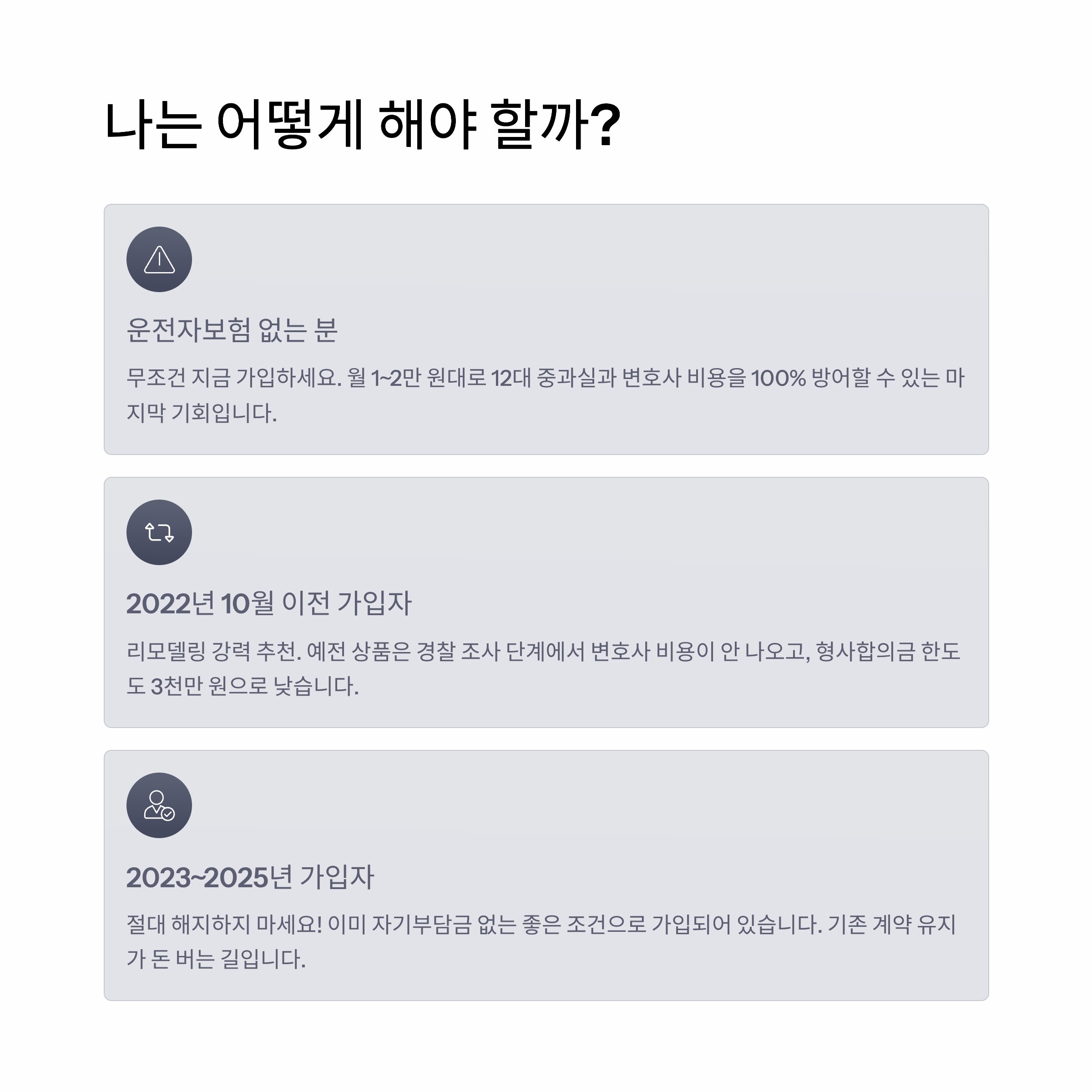 → 리모델링을 강력 추천합니다. 예전 상품은 '경찰 조사 단계'에서 변호사 비용이 안 나오는 경우가 많고, 형사합의금 한도도 3천만 원 수준으로 낮습니다(요즘은 2억 원 이상). 이번 기회에 최신 약관(경찰 조사 포함 + 변호사비 100% 보장)으로 갈아타는 것이 유리합니다.