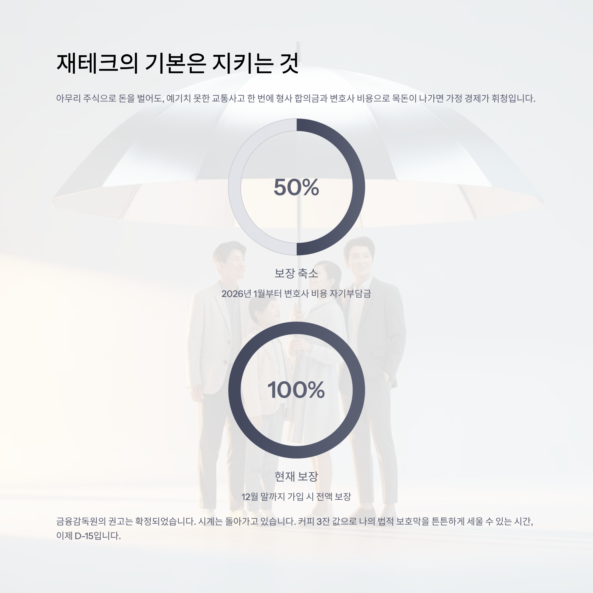 내년 1월, 뉴스에서 "운전자보험 혜택 축소" 기사가 쏟아질 때 "아, 그때 가입할걸" 하고 후회하지 마세요. 커피 3잔 값으로 나의 법적 보호막을 튼튼하게 세울 수 있는 시간, 이제 D-15입니다.