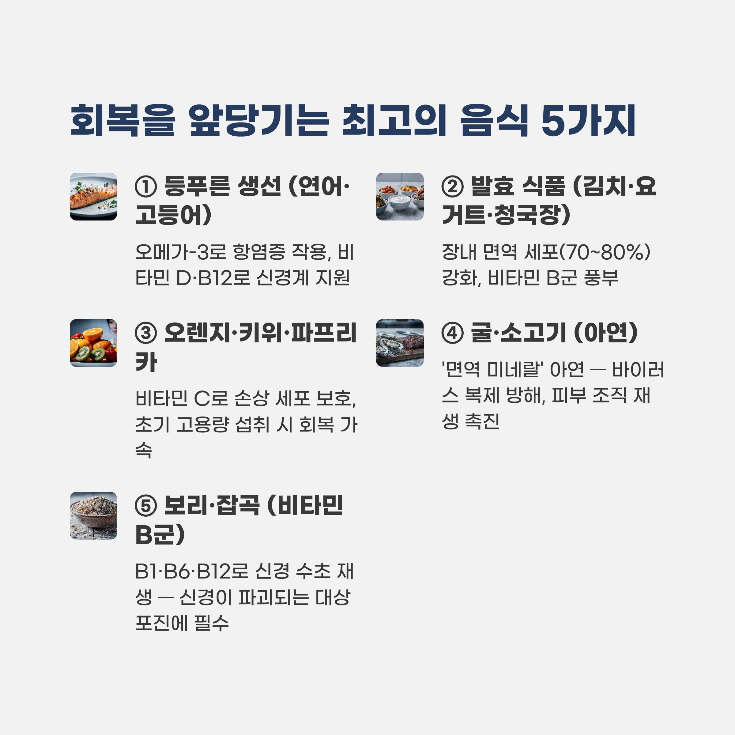 오늘은 소비자 입장에서 가장 궁금해할 대상포진 회복을 앞당기는 최고의 음식 5가지와 절대 피해야 할 최악의 음식, 그리고 신경 재생을 돕는 영양소까지 풍성한 내용을 담아 정리해 드립니다.