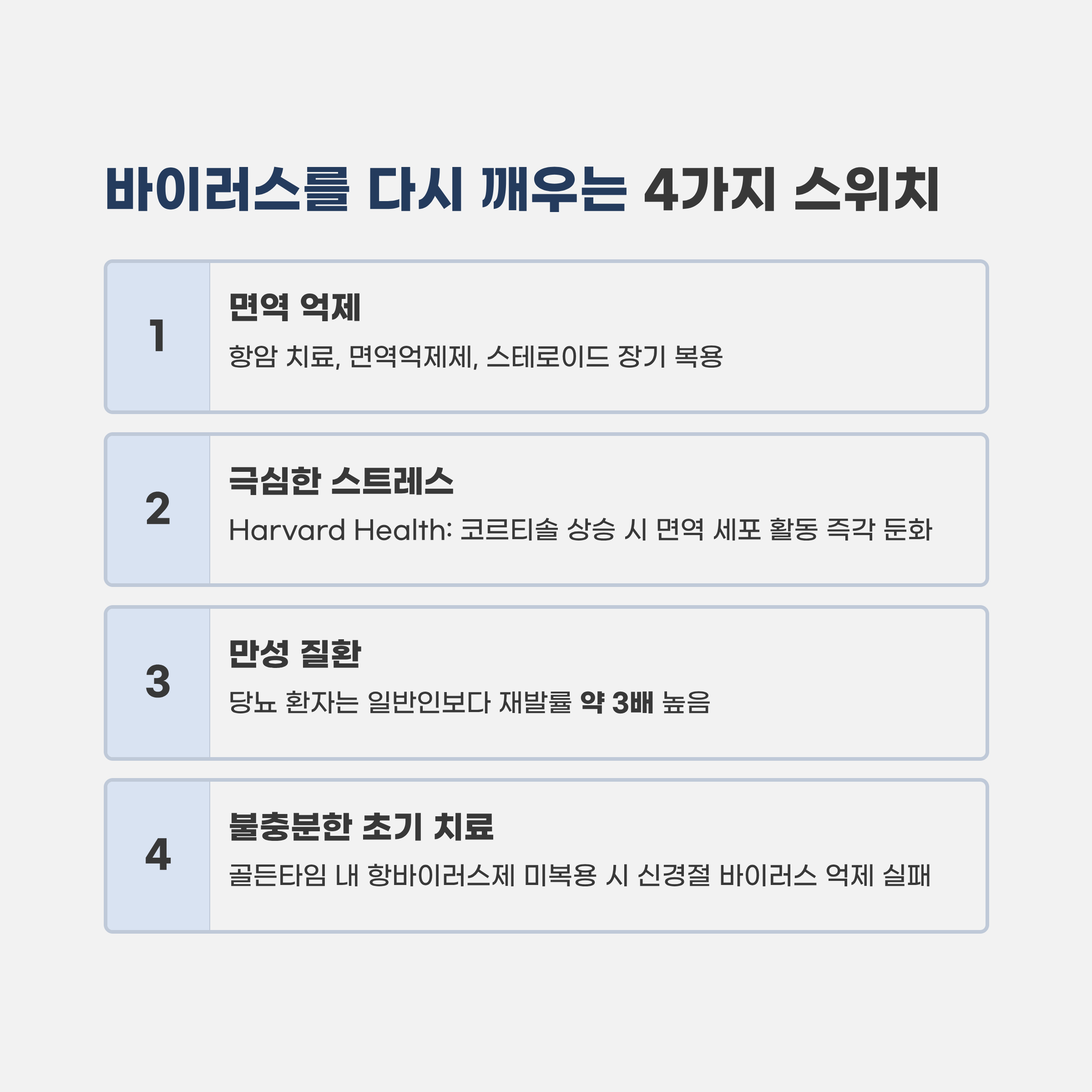 - 면역력의 유효기간: 몸속의 세포 매개 면역(T-세포)이 바이러스를 억제하고 있는 동안에는 조용하지만, 시간이 지나 면역력이 다시 기준치 이하로 떨어지면 바이러스는 언제든 다시 깨어날 준비를 합니다.