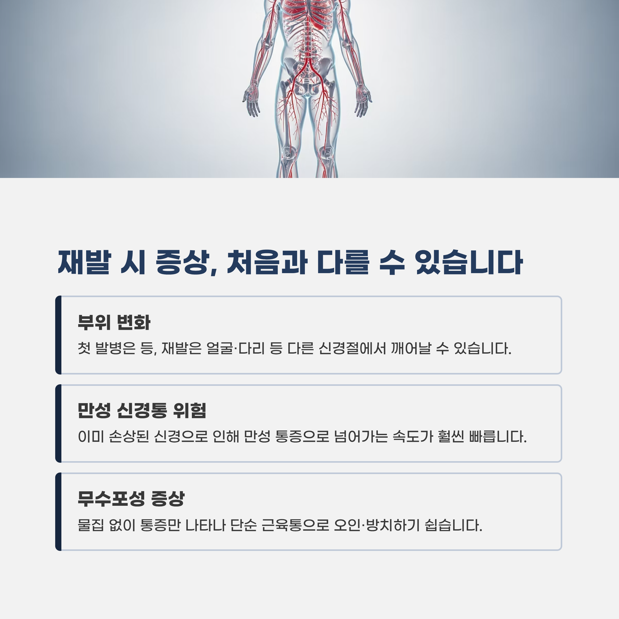 - 통증의 강도: 재발이라고 해서 반드시 더 아픈 것은 아니지만, 이미 신경이 한 차례 손상된 상태라면 만성 신경통으로 넘어가는 속도가 훨씬 빠를 수 있습니다.