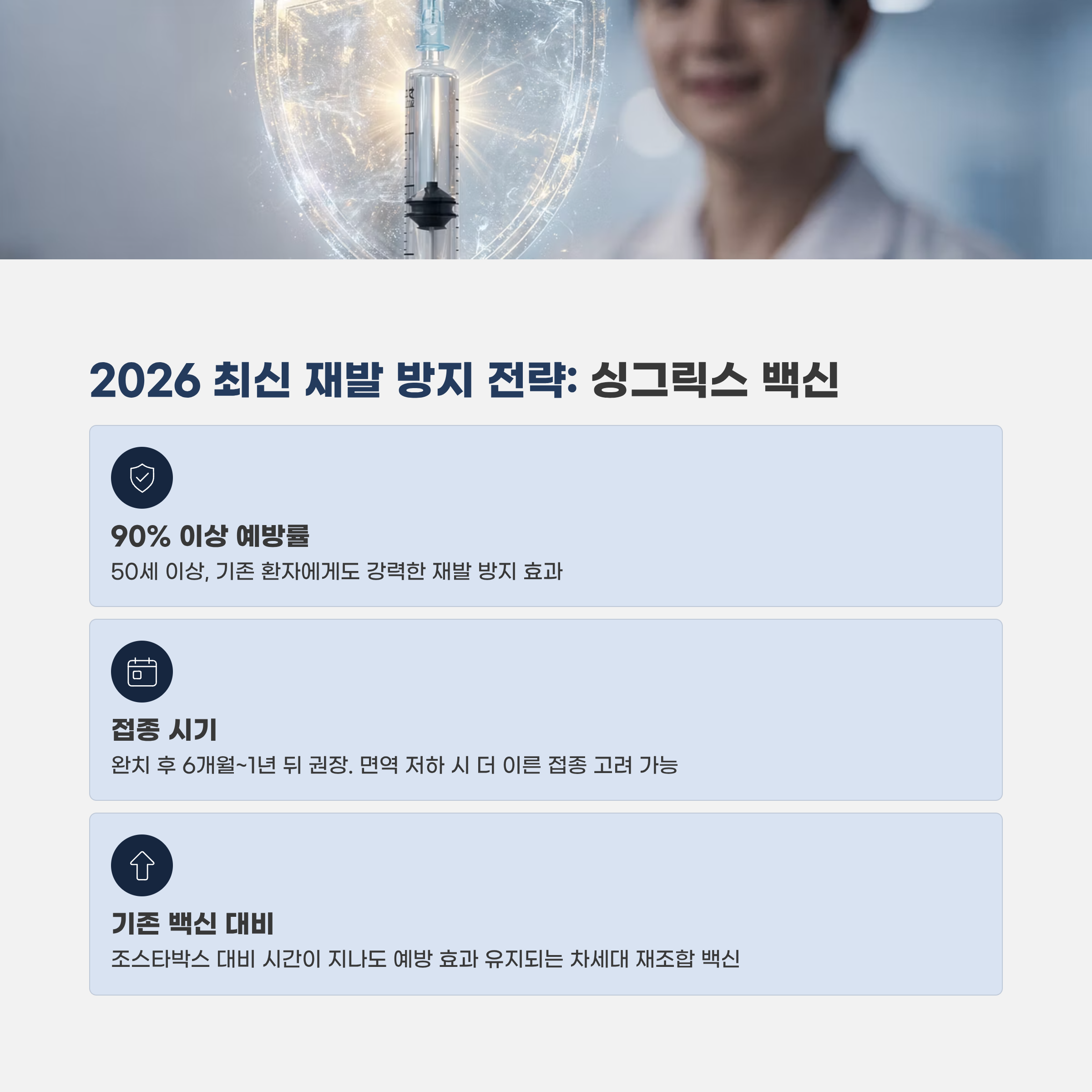 재발을 막는 가장 강력한 무기는 현재로서는 '싱그릭스(Shingrix)' 접종입니다.