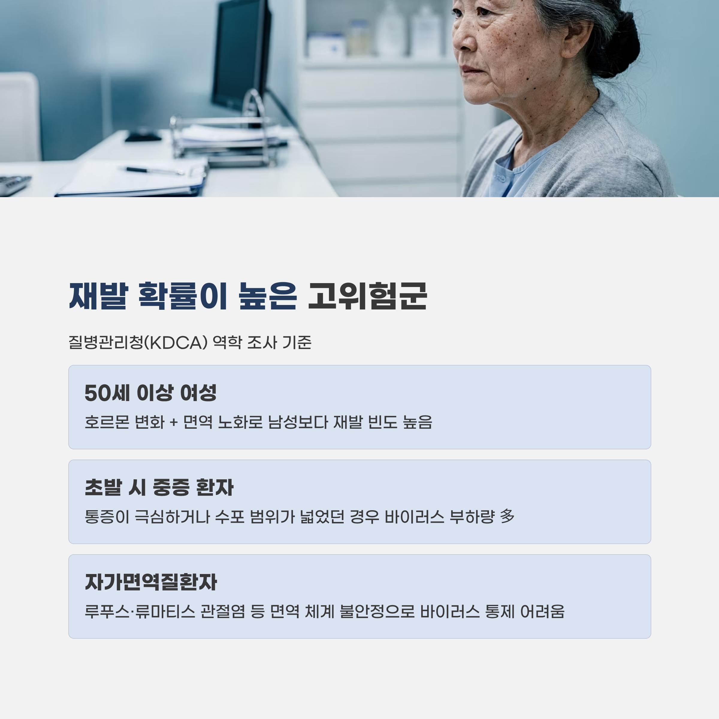 - 50세 이상의 여성: 호르몬 변화와 면역 노화가 겹치며 남성보다 재발 빈도가 높은 것으로 나타납니다.