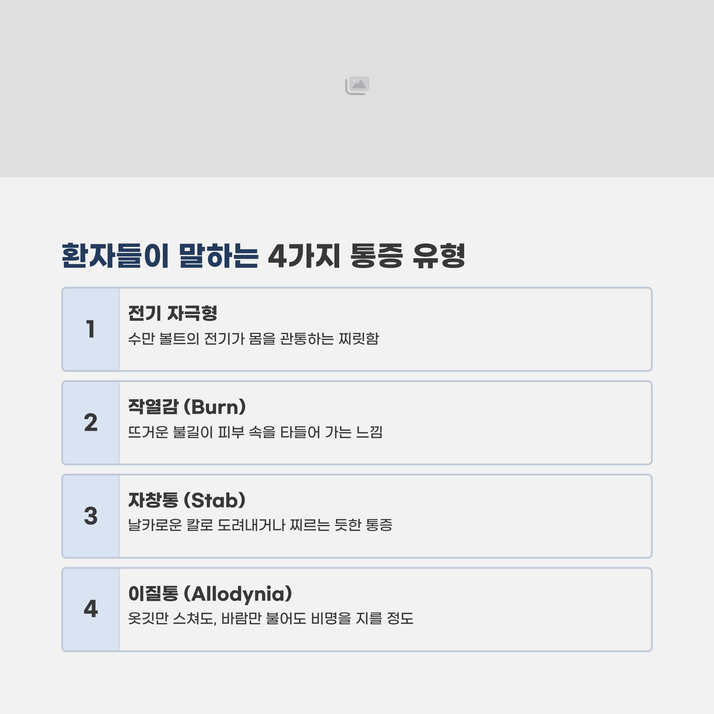 | 만성 신경통 (PHN) | 피부가 완치된 후에도 지속되는 통증 | 7~9점 (만성적) |