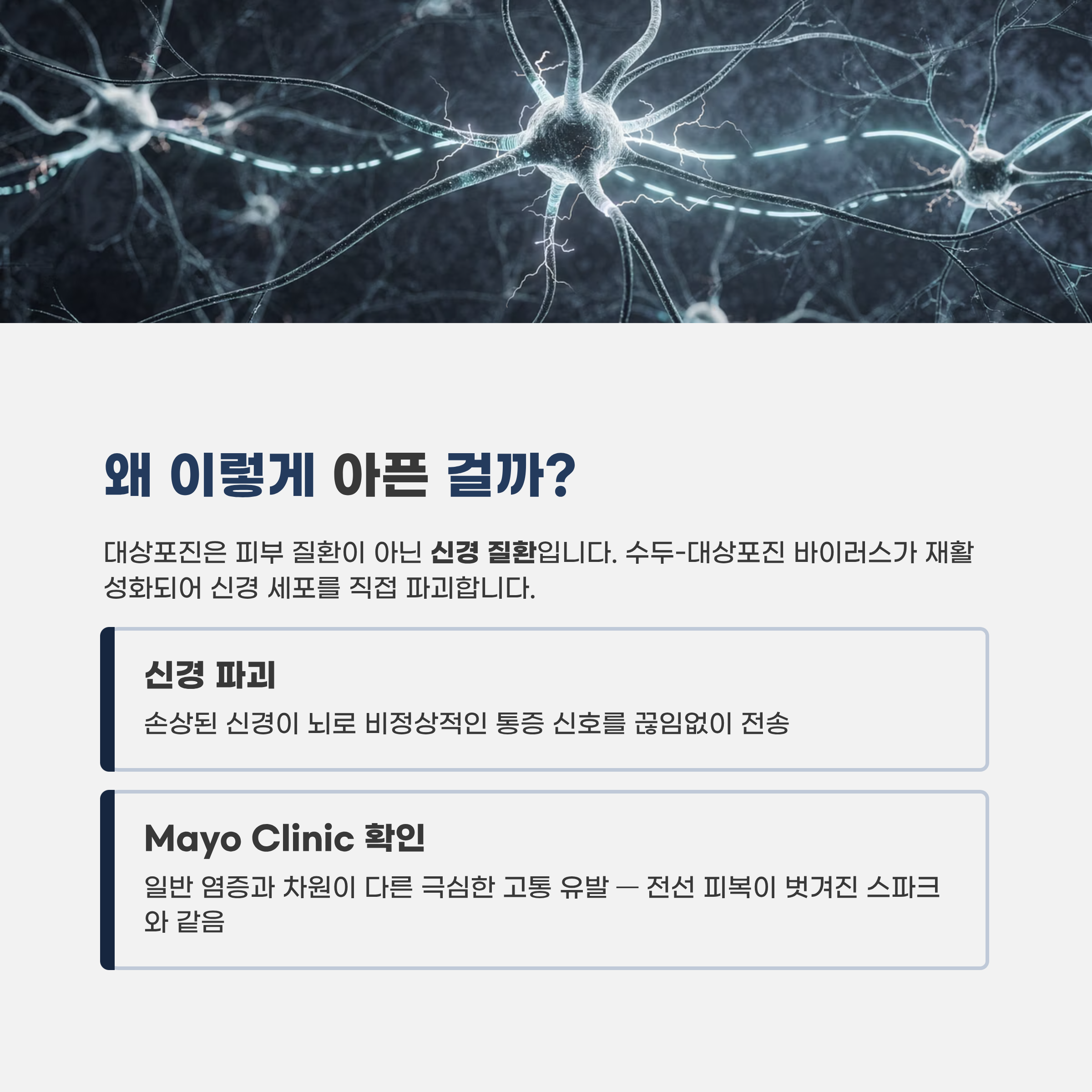대상포진의 통증이 유독 지독한 이유는 이 병이 피부 질환이 아닌 **'신경 질환'**이기 때문입니다.