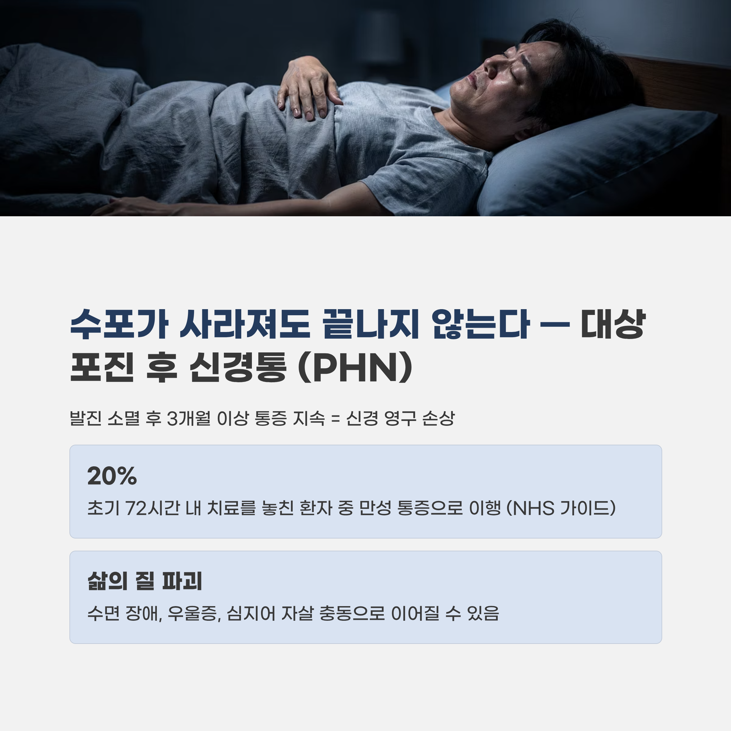 가장 무서운 것은 수포가 사라진 뒤에도 통증이 남는 **'대상포진 후 신경통'**입니다. 발진이 사라진 후 3개월 이상 통증이 지속된다면 신경이 이미 영구적으로 손상되었음을 의미합니다.