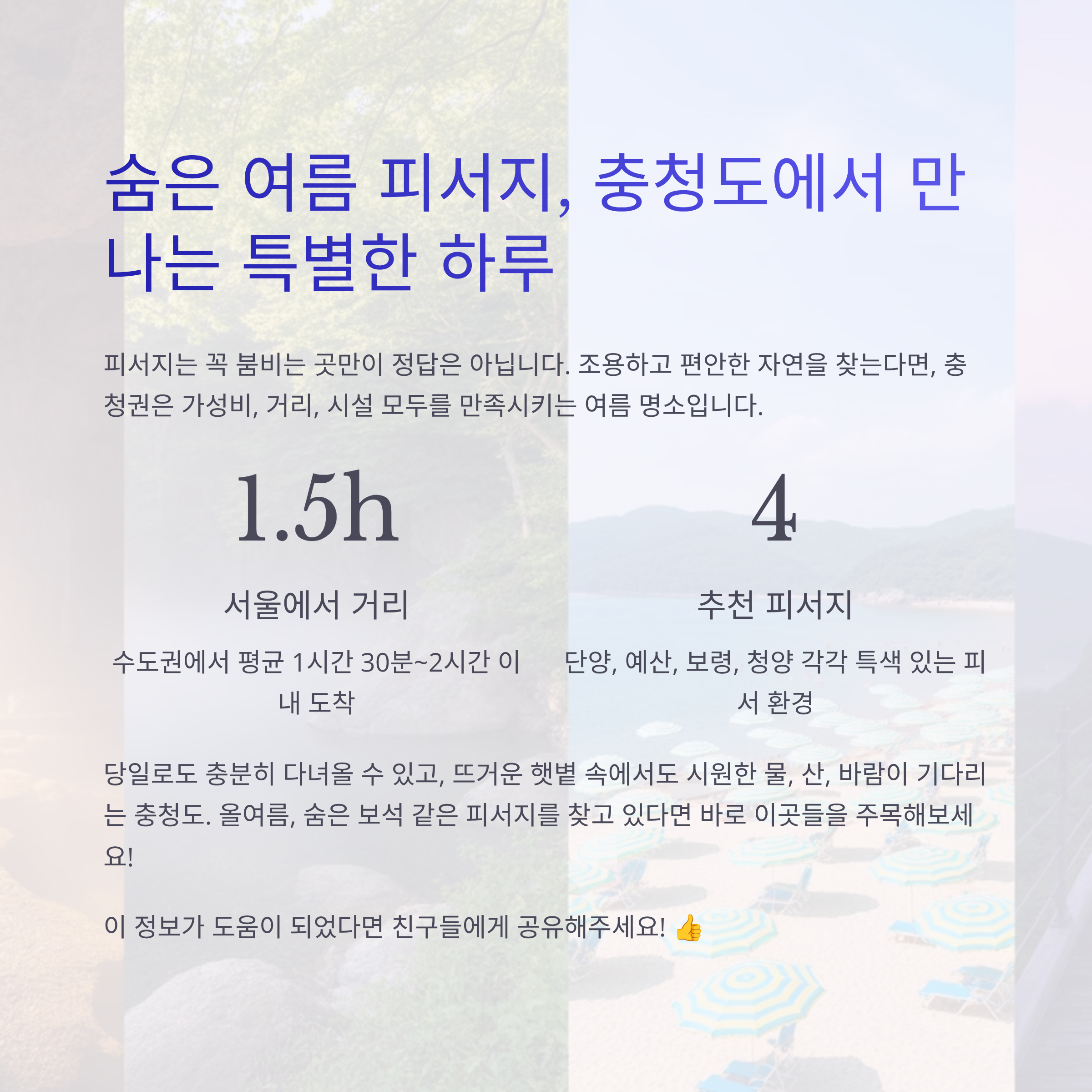 이번 글에서는 2025년 여름 기준으로 추천하는 충청권 당일치기 피서지 4곳을 소개합니다.