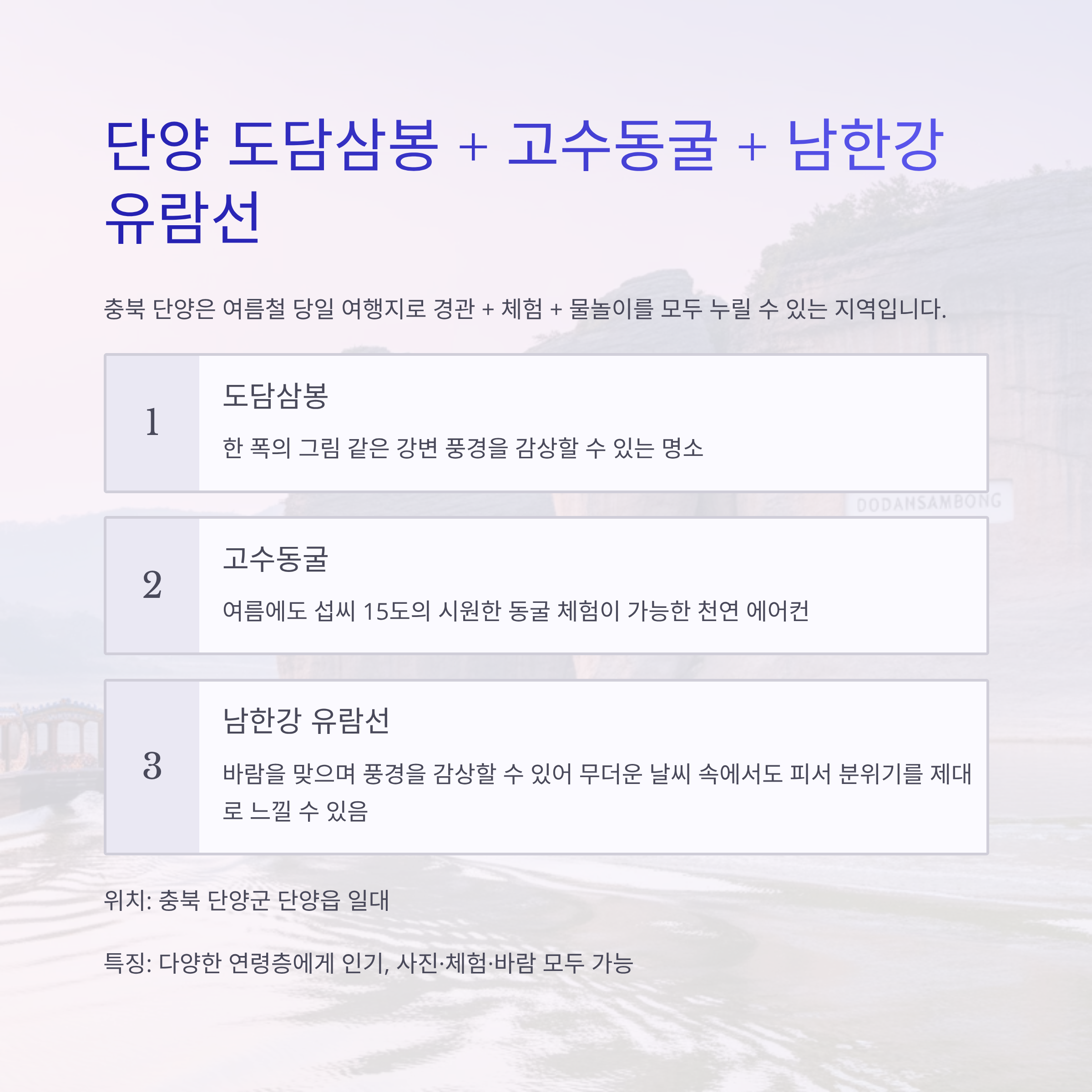 충북 단양은 여름철 당일 여행지로 경관 + 체험 + 물놀이를 모두 누릴 수 있는 지역입니다.