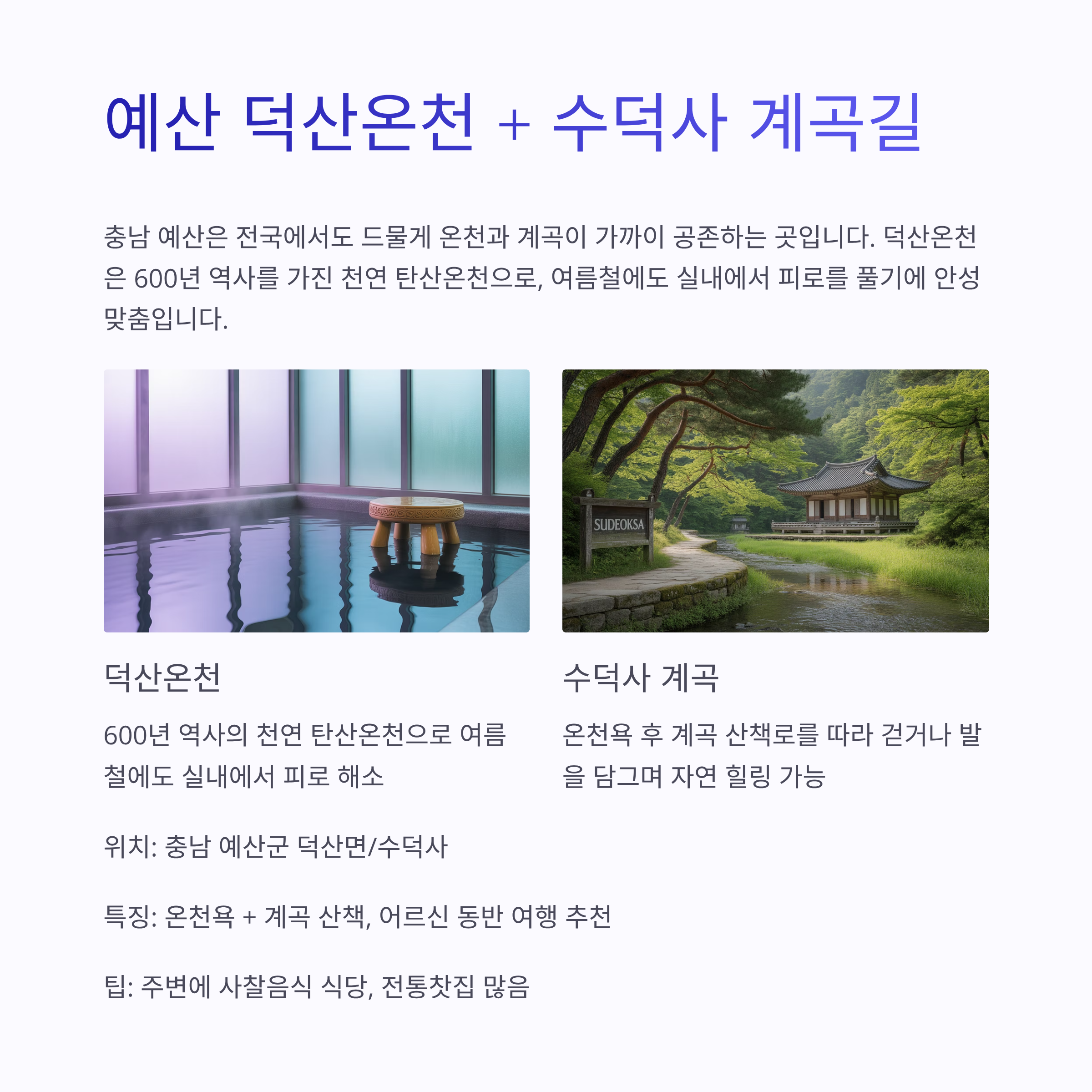 - 시니어/부모님 동반: 예산 온천 + 수덕사 계곡 코스