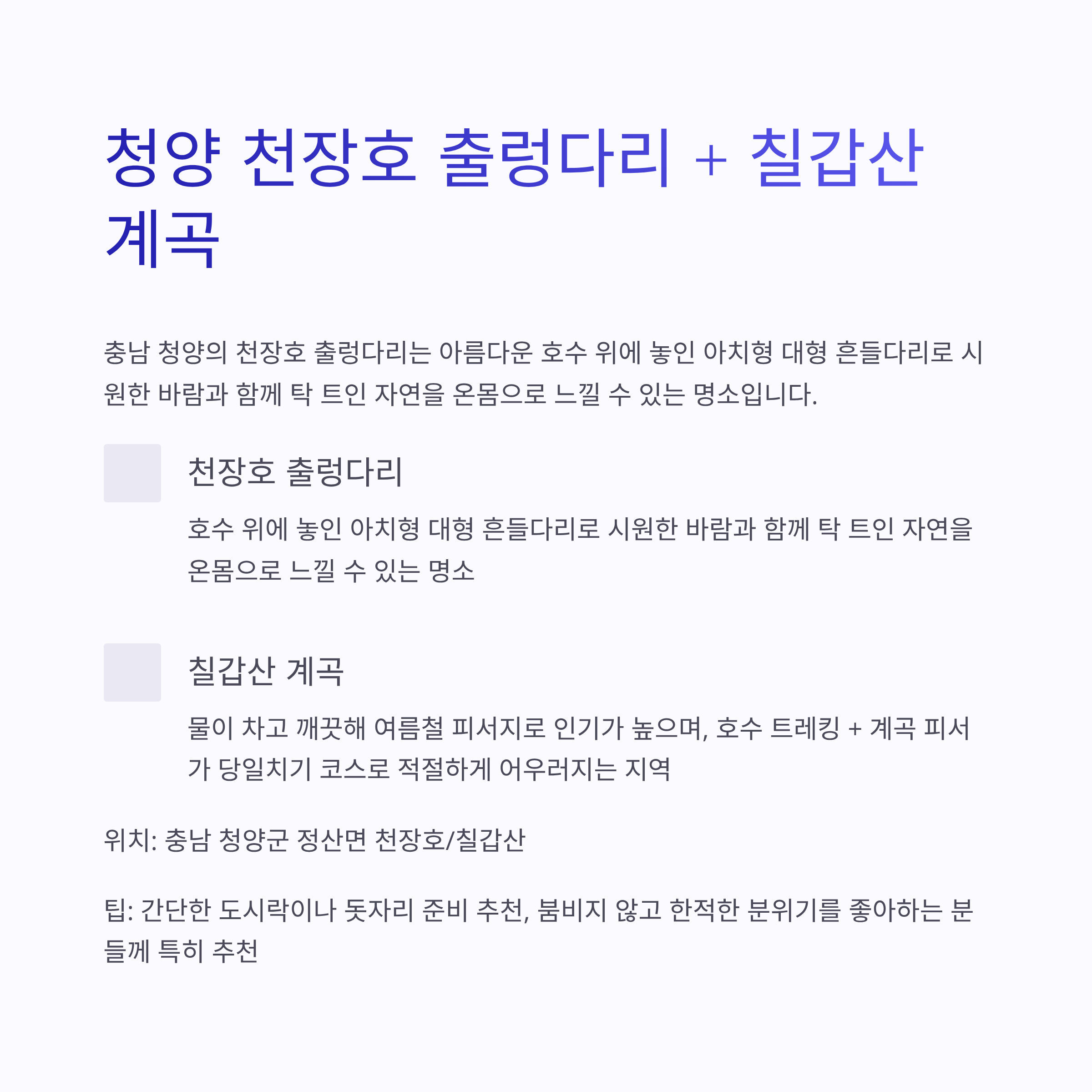 - 조용한 힐링: 청양 출렁다리 + 계곡 트레킹 조합 추천