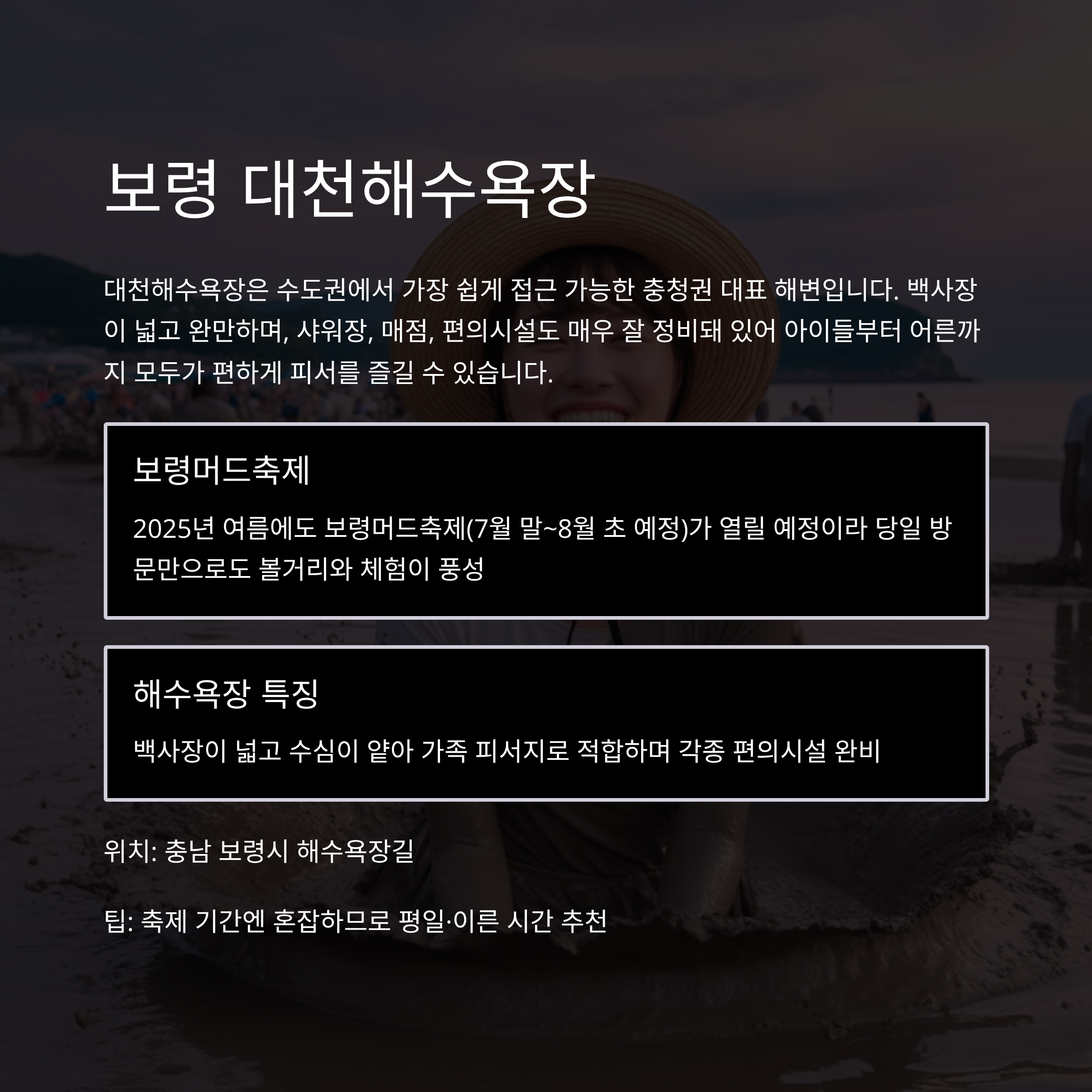 | 바다 피서 | 보령 | 축제+해수욕 가능 |