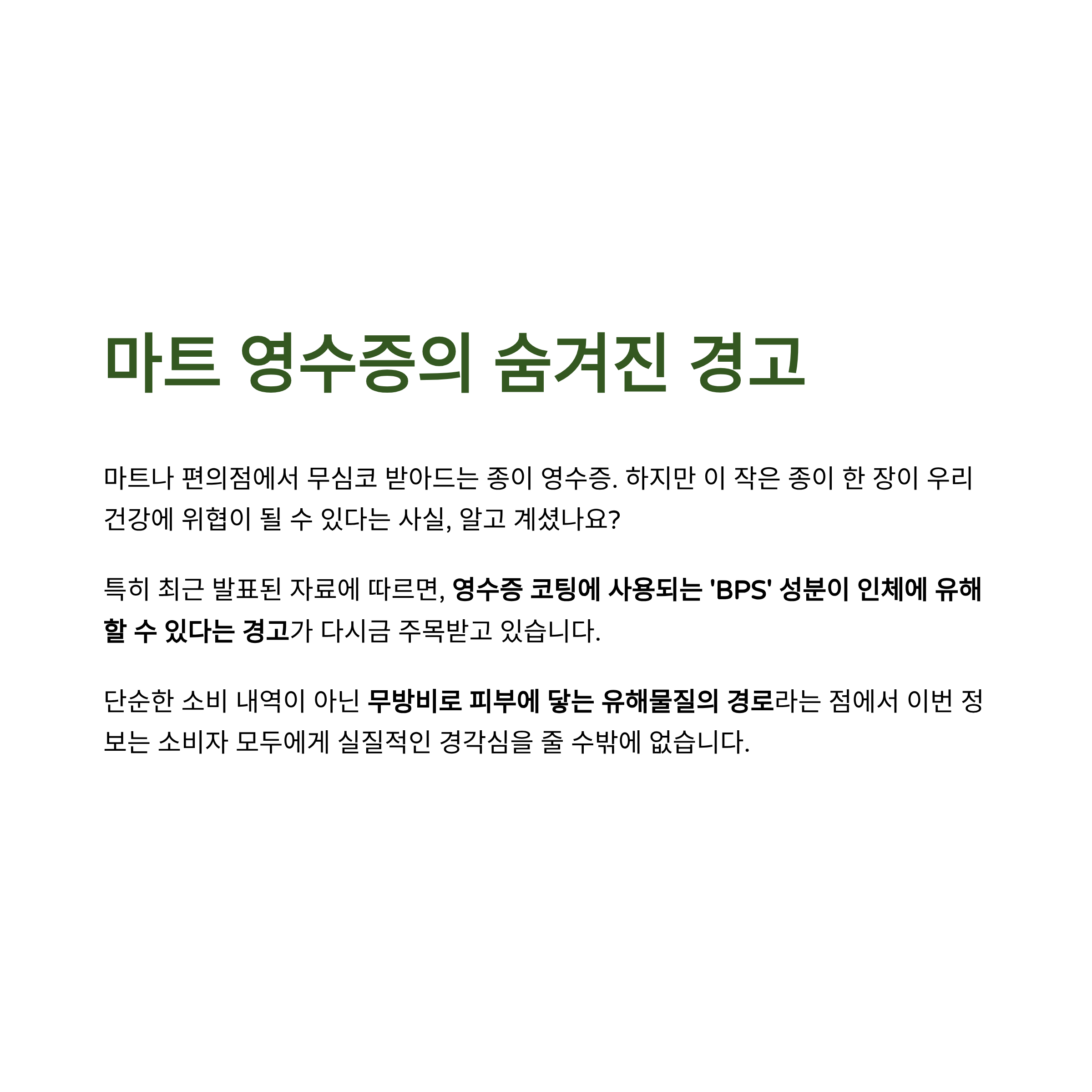 마트나 편의점에서 무심코 받아드는 종이 영수증. 하지만 이 작은 종이 한 장이 우리 건강에 위협이 될 수 있다는 사실, 알고 계셨나요? 특히 최근 발표된 자료에 따르면, 영수증 코팅에 사용되는 'BPS' 성분이 인체에 유해할 수 있다는 경고가 다시금 주목받고 있습니다. 단순한 소비 내역이 아닌 무방비로 피부에 닿는 유해물질의 경로라는 점에서 이번 정보는 소비자 모두에게 실질적인 경각심을 줄 수밖에 없습니다.