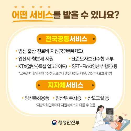 | 전국 공통 서비스 | 엽산제 및 철분제 지원, 국민행복카드 발급, KTX/SRT 할인, 표준 모자보건수첩 배부 |