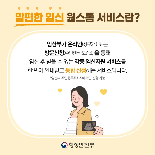 맘편한 임신 원스톱 서비스는 임산부가 다양한 임신 지원 서비스를 온라인 또는 주민센터에서 간편하게 신청할 수 있는 통합 서비스입니다. 이 서비스는 정부24 웹사이트나 가까운 주민센터에서 신청 가능하며, 임신 지원 서비스를 하나하나 따로 신청하지 않아도 한 번에 처리할 수 있어 매우 편리합니다.