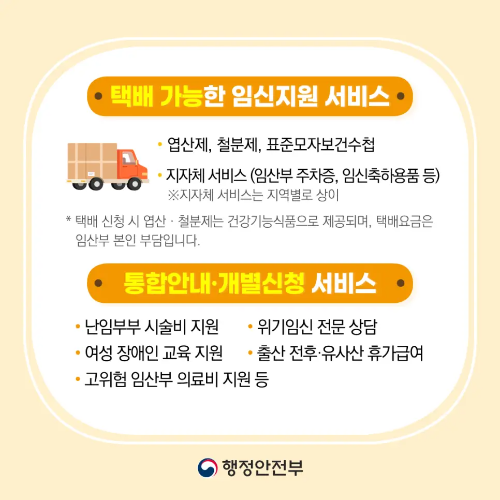 | 택배 가능 서비스 | 엽산제, 철분제, 표준 모자보건수첩, 지자체별 축하용품 등 (택배 요금은 본인 부담) |