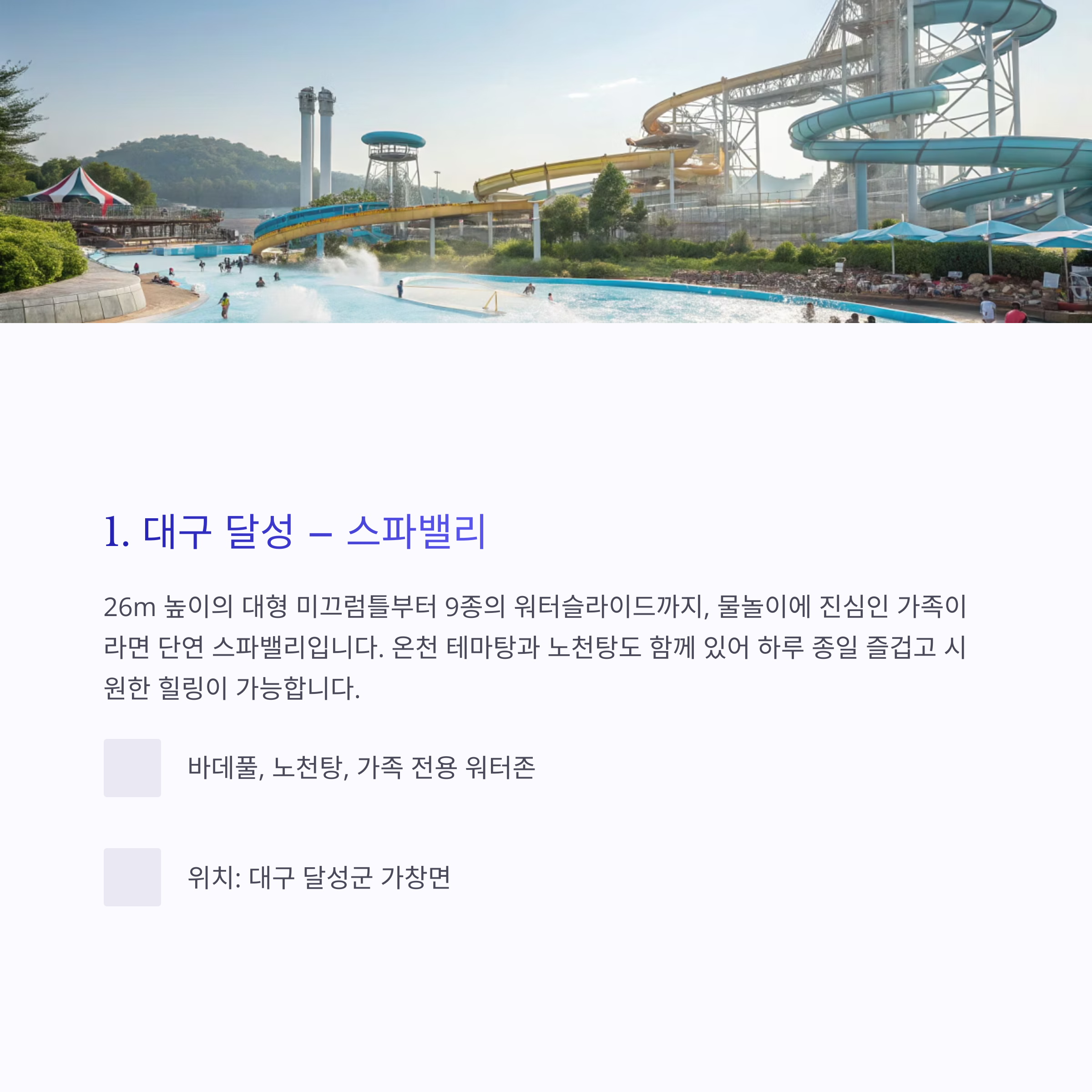 1. 대구 달성 – 스파밸리: 워터슬라이드와 온천의 완벽한 조화