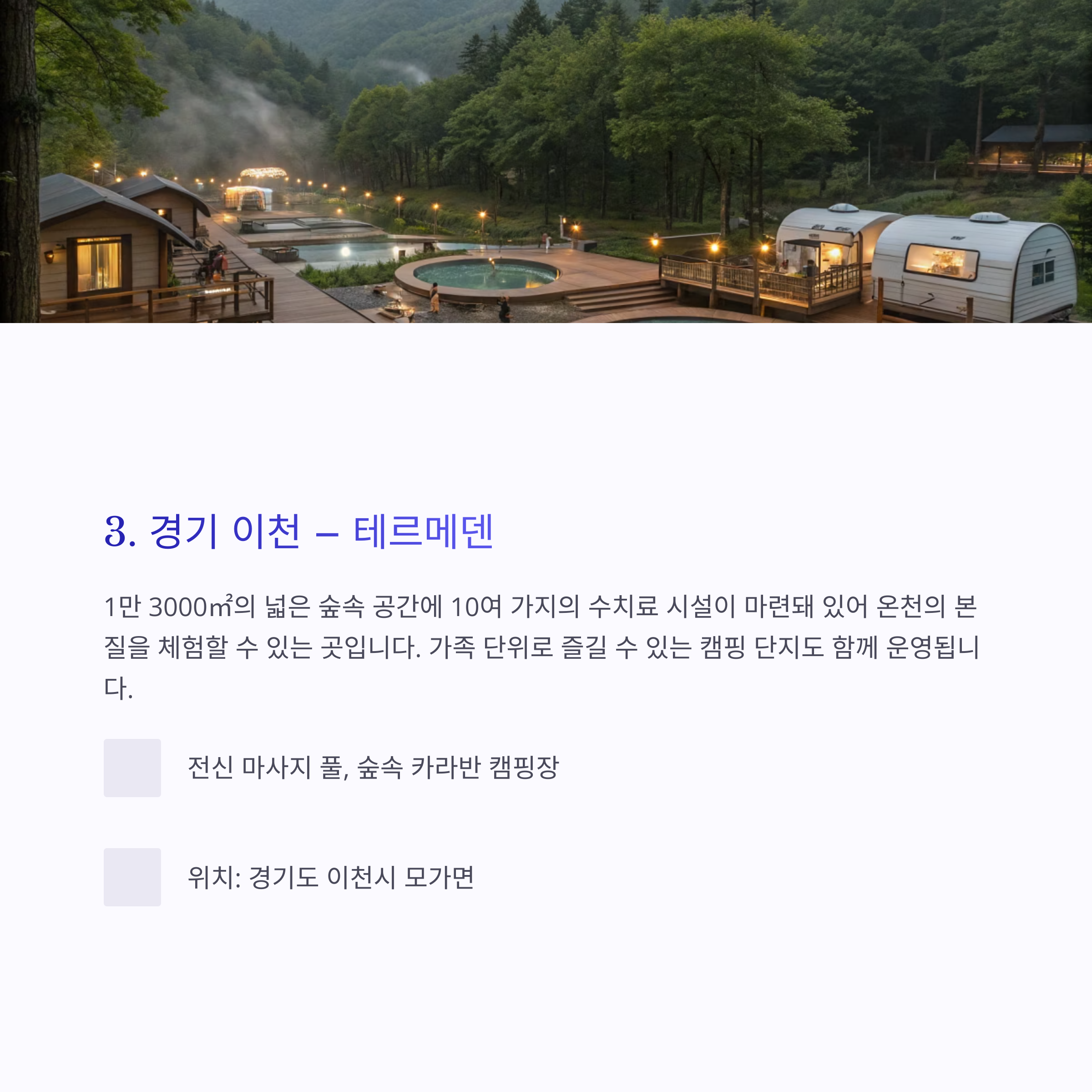 - 주요 특징: 전신 마사지 풀, 숲속 카라반 캠핑장