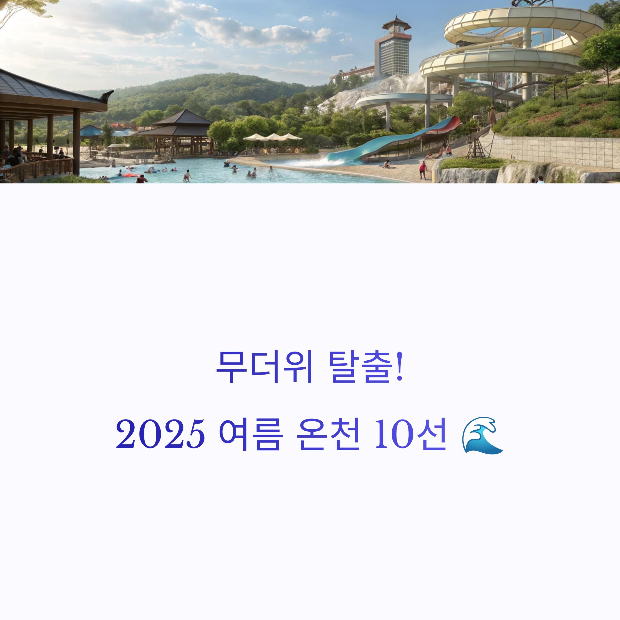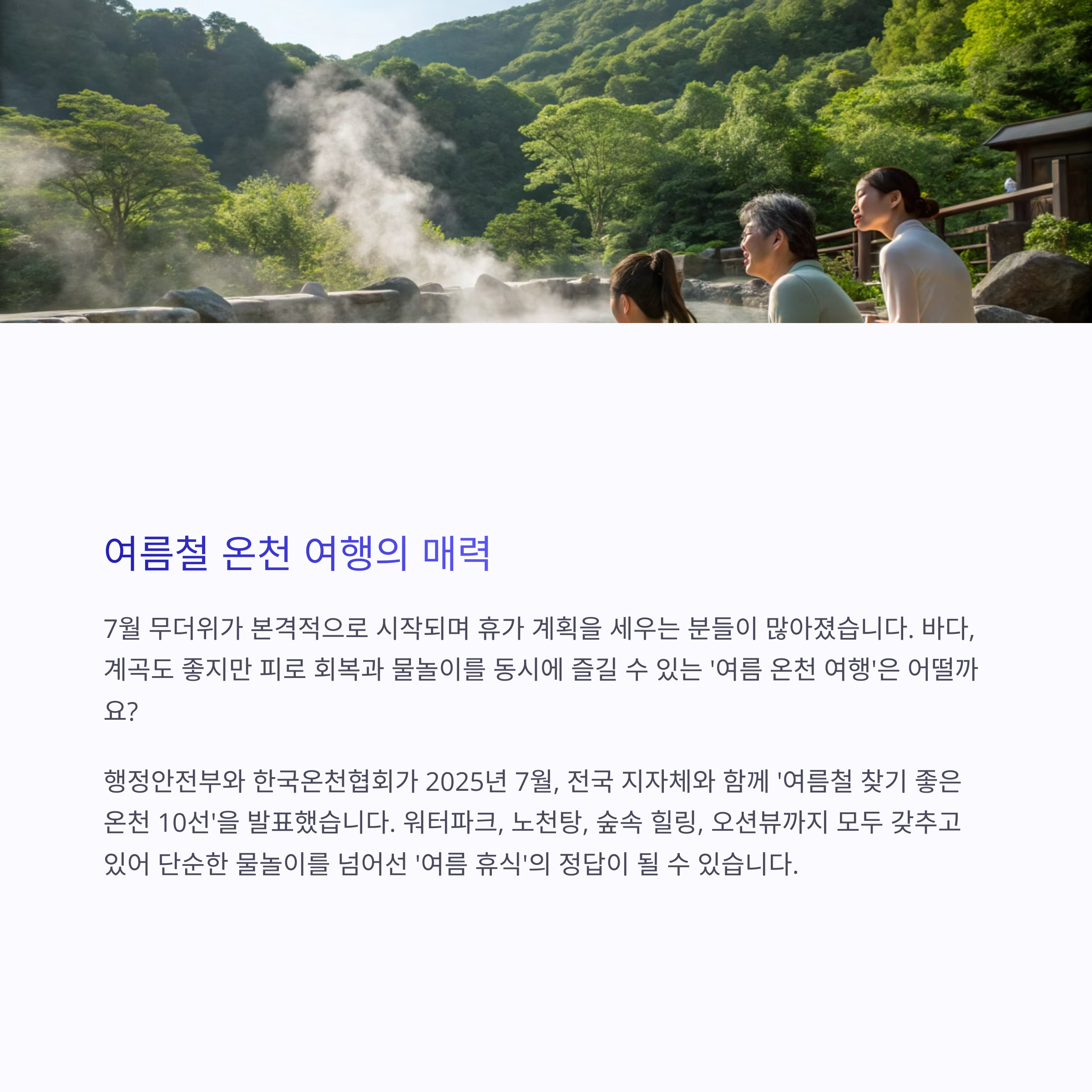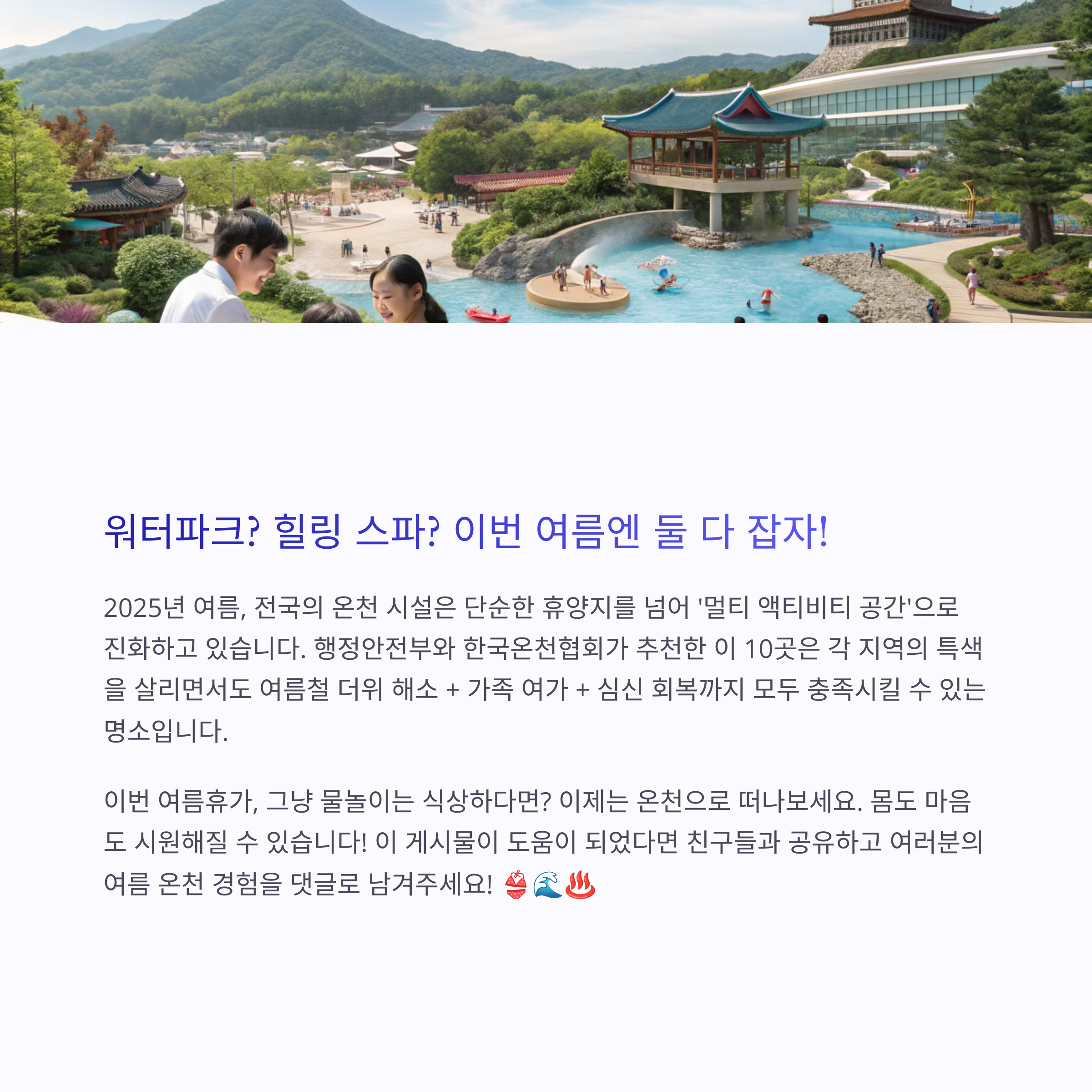 7월 무더위가 본격적으로 시작되며 휴가 계획을 세우는 분들이 많아졌습니다. 바다, 계곡도 좋지만 피로 회복과 물놀이를 동시에 즐길 수 있는 '여름 온천 여행'은 어떨까요? 행정안전부와 한국온천협회가 2025년 7월, 전국 지자체와 함께 **‘여름철 찾기 좋은 온천 10선’**을 발표했습니다. 테마별로 다양하게 구성된 이 온천 리스트는 워터파크, 노천탕, 숲속 힐링, 오션뷰까지 모두 갖추고 있어 단순한 물놀이를 넘어선 '여름 휴식'의 정답이 될 수 있습니다. 지금부터 지역별 특색이 살아 있는 온천 10곳을 자세히 소개합니다.