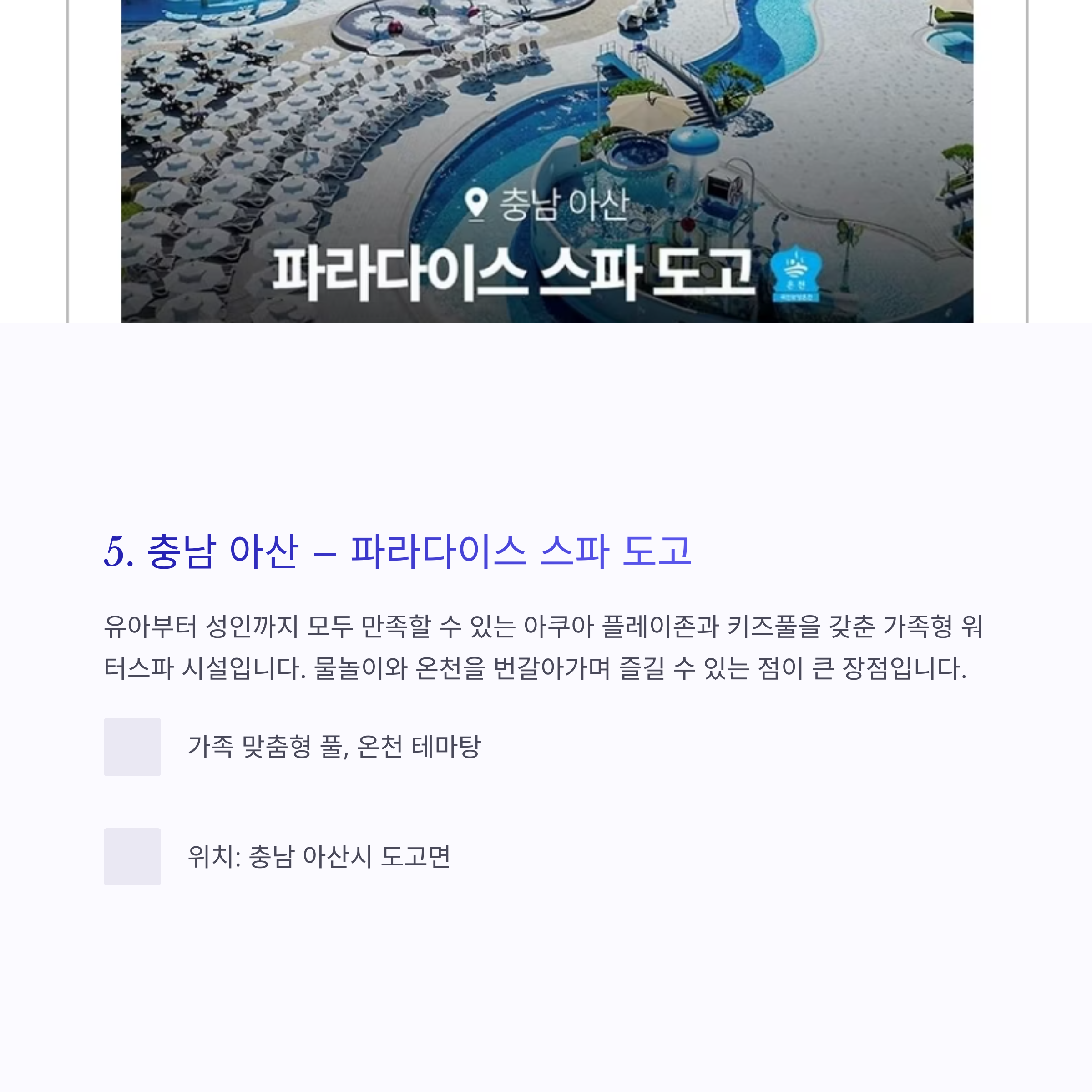 5. 충남 아산 – 파라다이스 스파 도고: 키즈풀부터 스파존까지 올인원