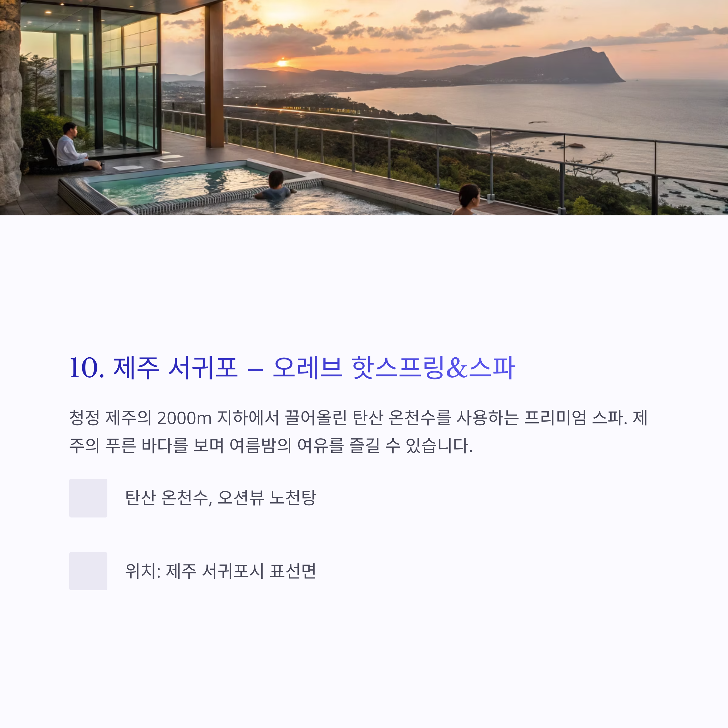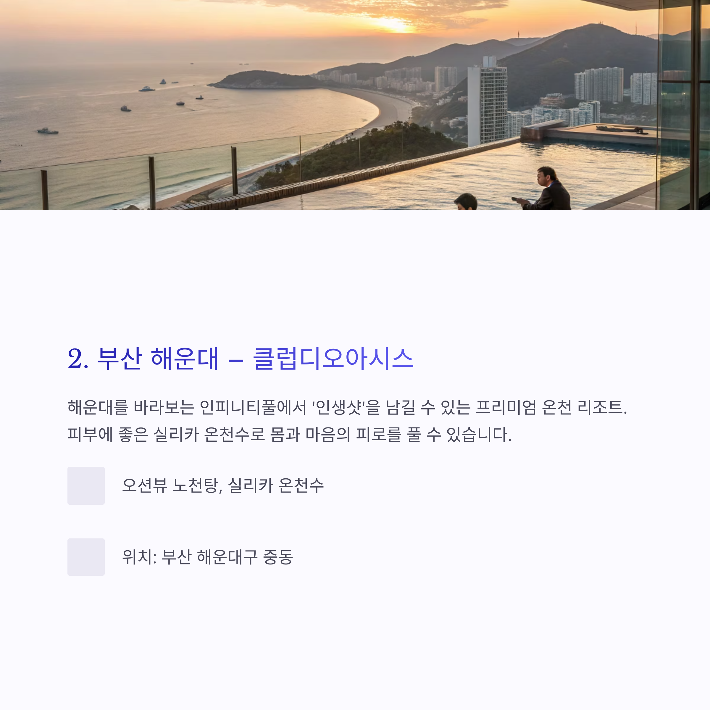 - 주요 특징: 오션뷰 노천탕, 실리카 온천수