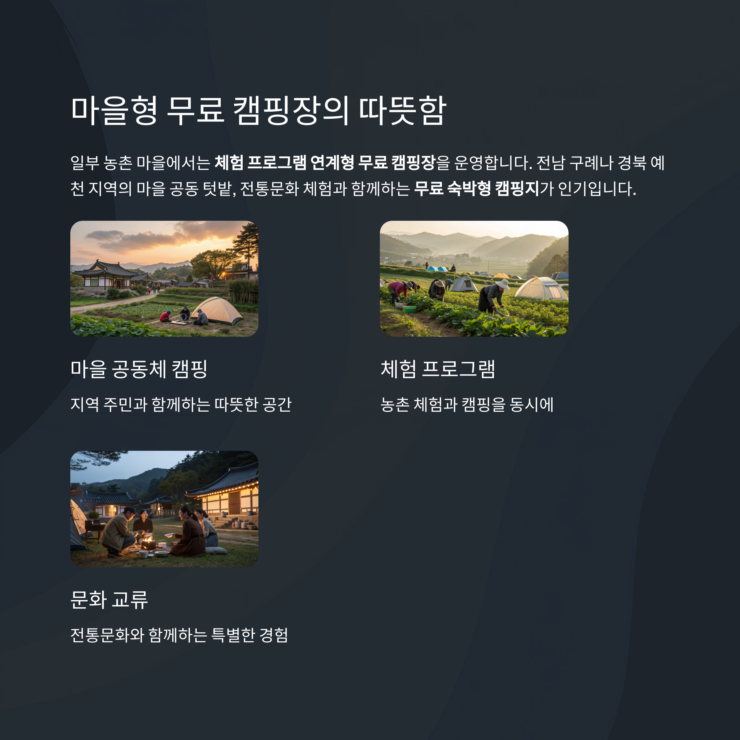 일부 농촌 마을에서는 체험 프로그램 연계형 무료 캠핑장을 운영합니다.