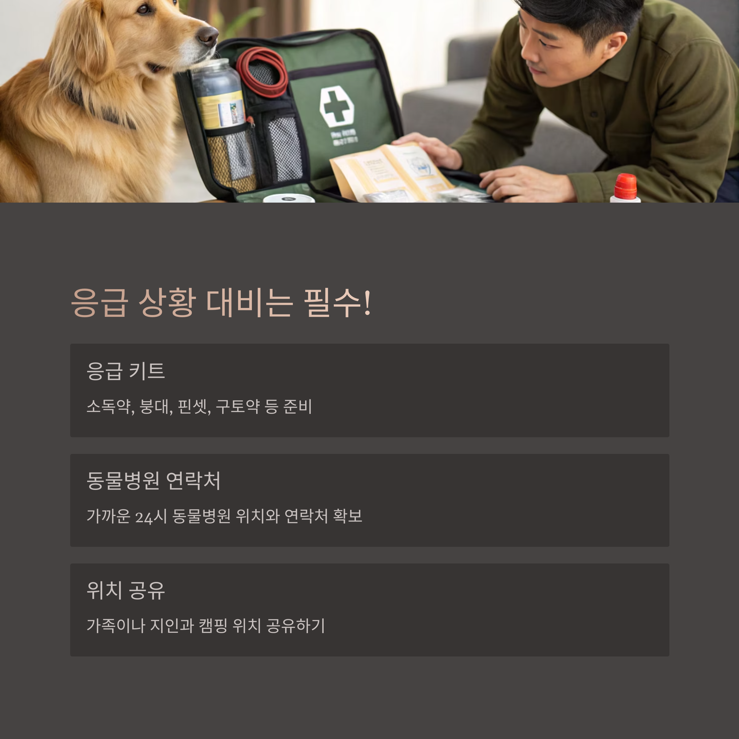기본 응급약과 동물병원 연락처를 준비해두어야 합니다.