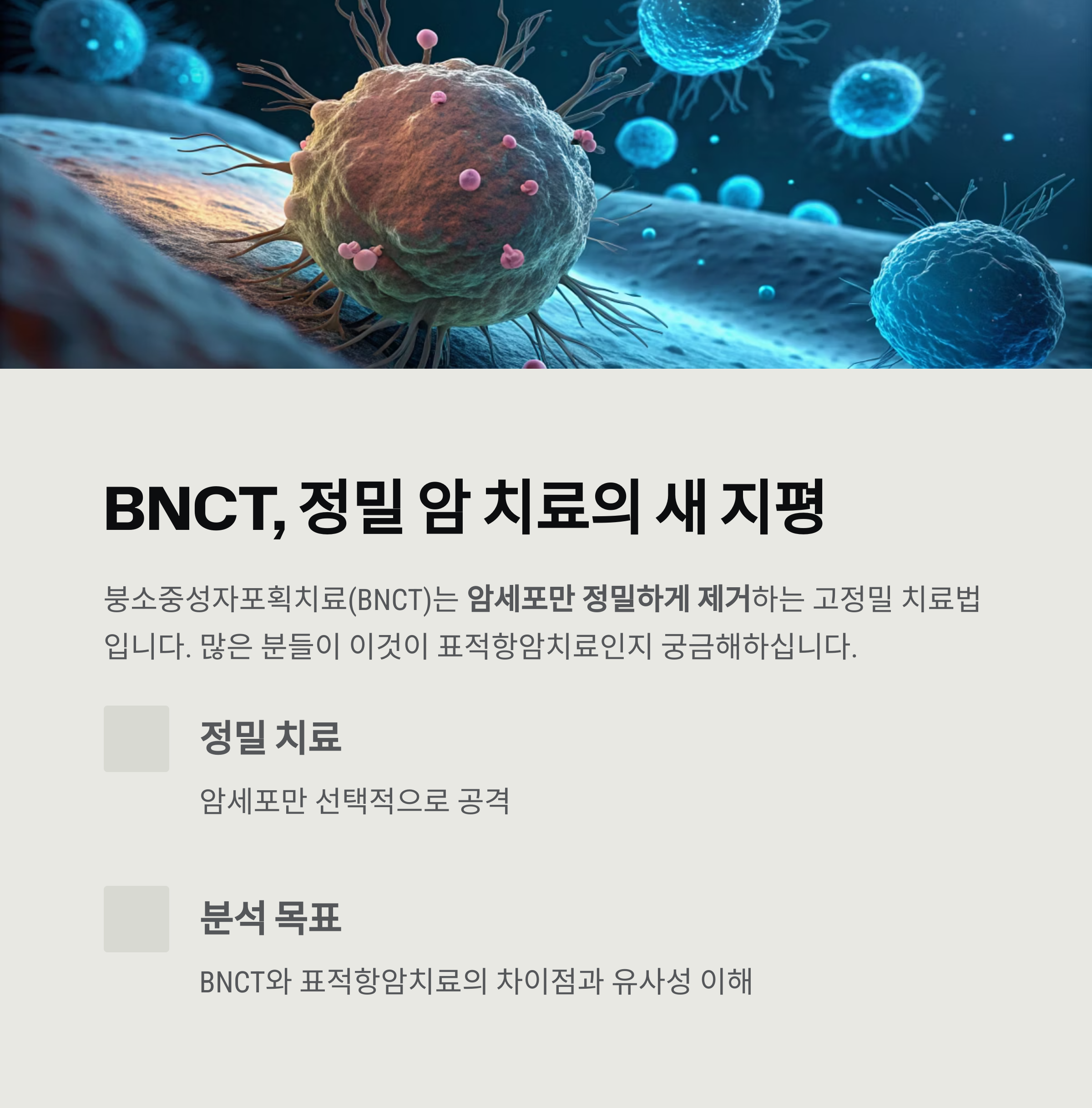 이번 BNCT 시리즈의 2편에서는 BNCT와 표적항암치료의 차이점과 유사성을 집중 분석해, 두 치료법을 올바르게 이해할 수 있도록 돕고자 합니다.