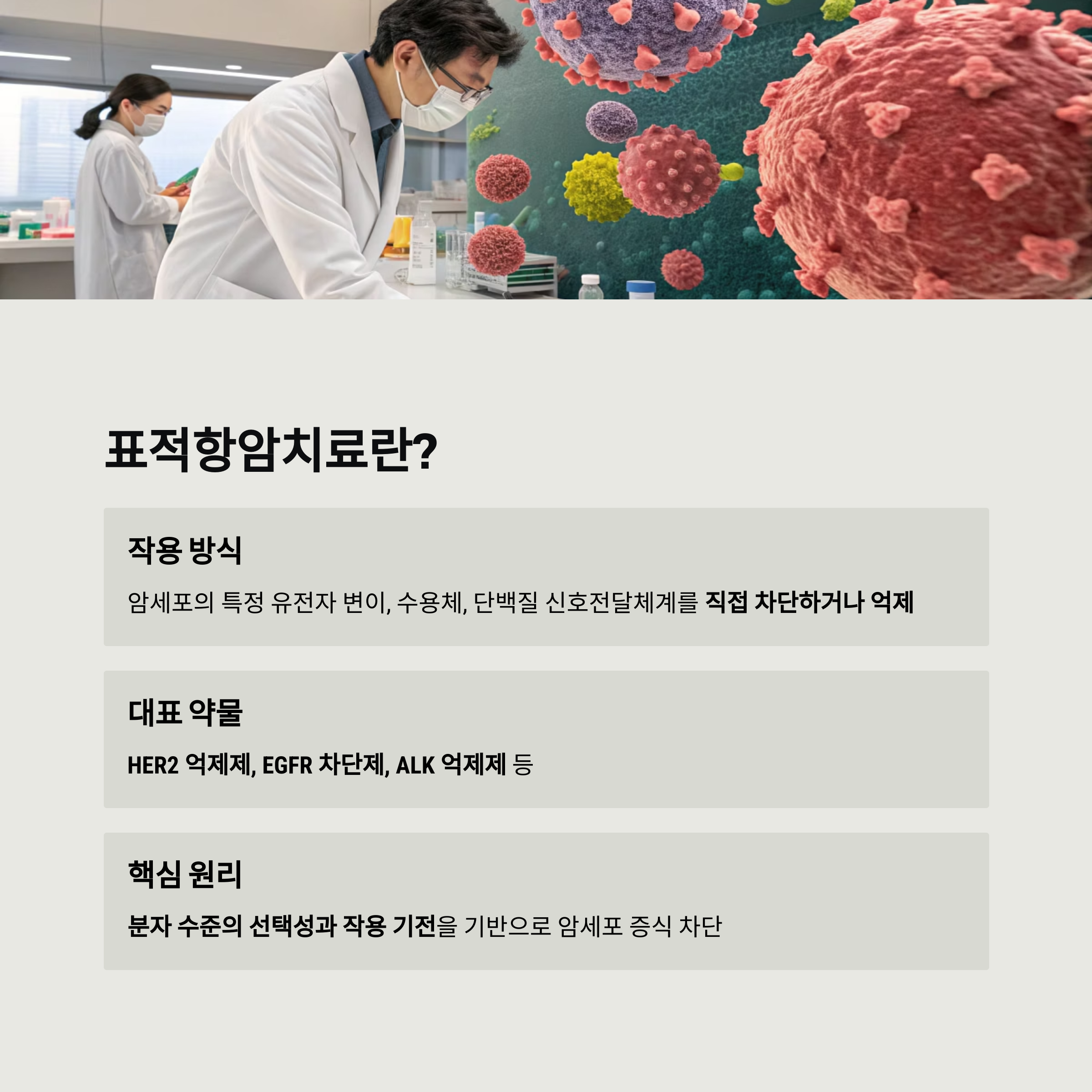 대표적으로는 HER2 억제제, EGFR 차단제, ALK 억제제 등이 있으며, 유전자 변이를 확인하고 이를 근거로 정밀하게 투약하는 것이 핵심입니다.