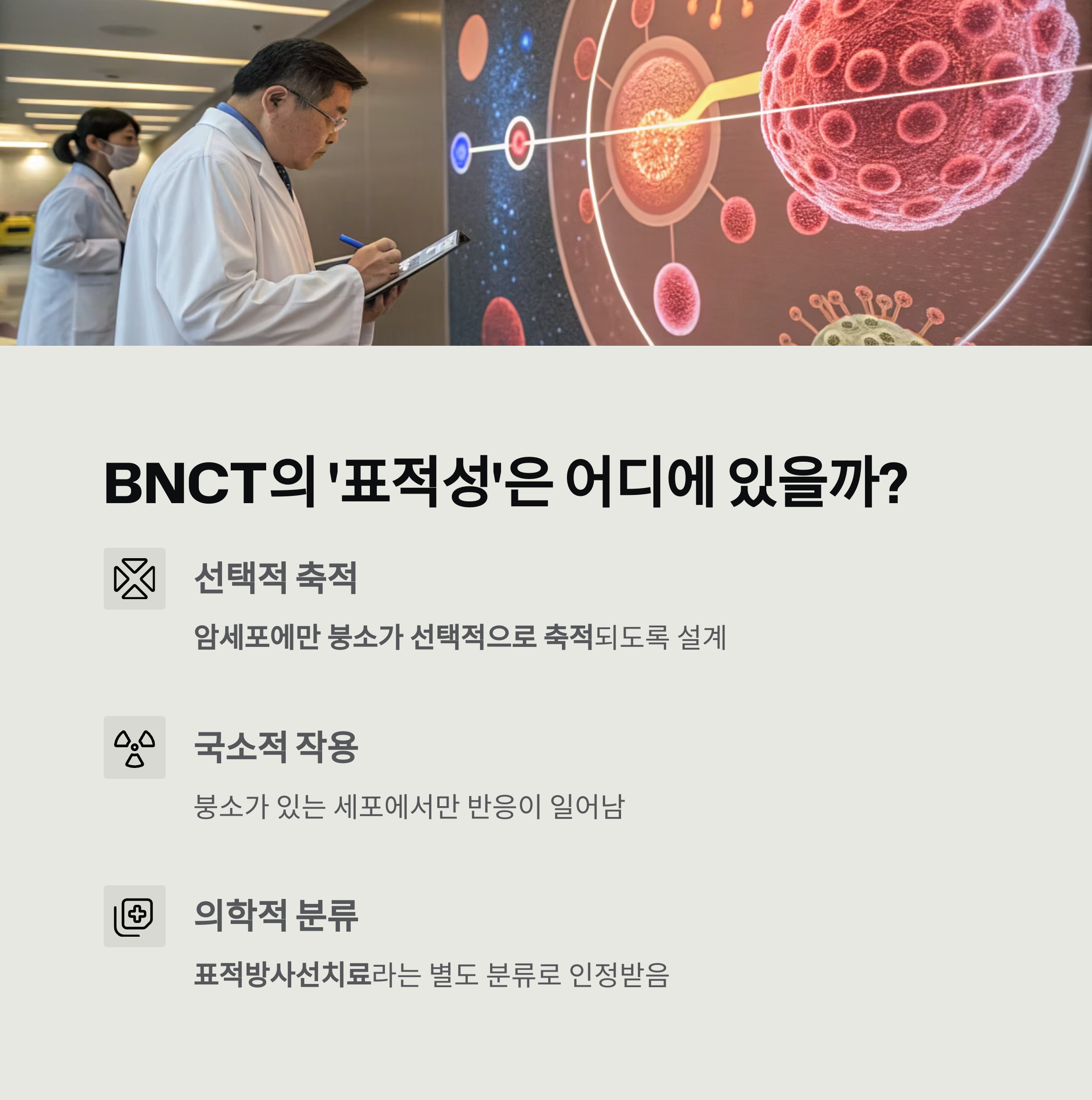 BNCT는 분자 표적항암제처럼 세포 내 신호 경로를 차단하거나 유전자 변이를 직접 겨냥하지는 않지만, 암세포에만 붕소가 선택적으로 축적되도록 설계되어 있다는 점에서 '표적성'을 분명히 가집니다.