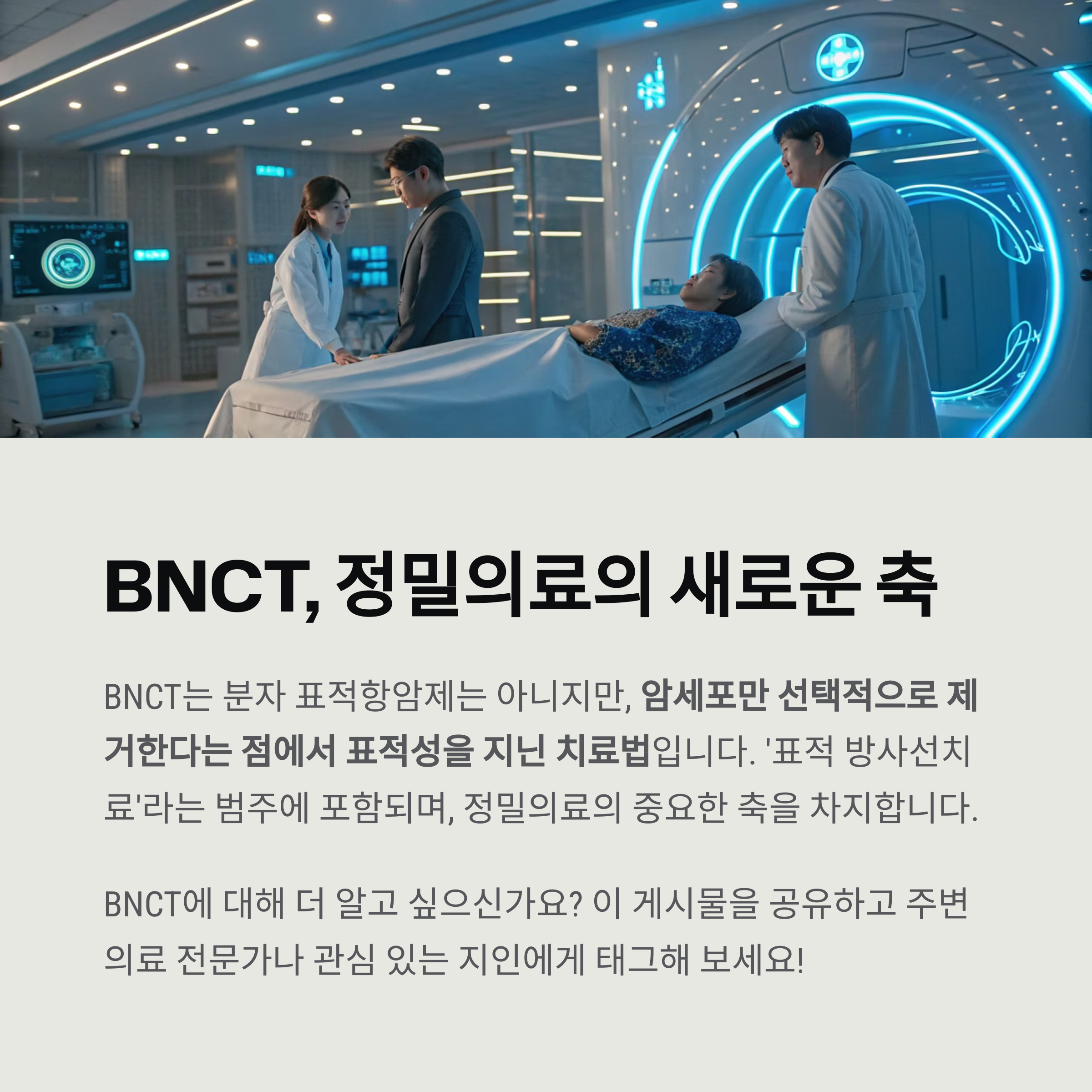 국제 방사선학회나 암치료 가이드라인에서는 BNCT를 “고정밀 방사선치료” 또는 “하이브리드 표적 방사선치료”로 분류합니다.