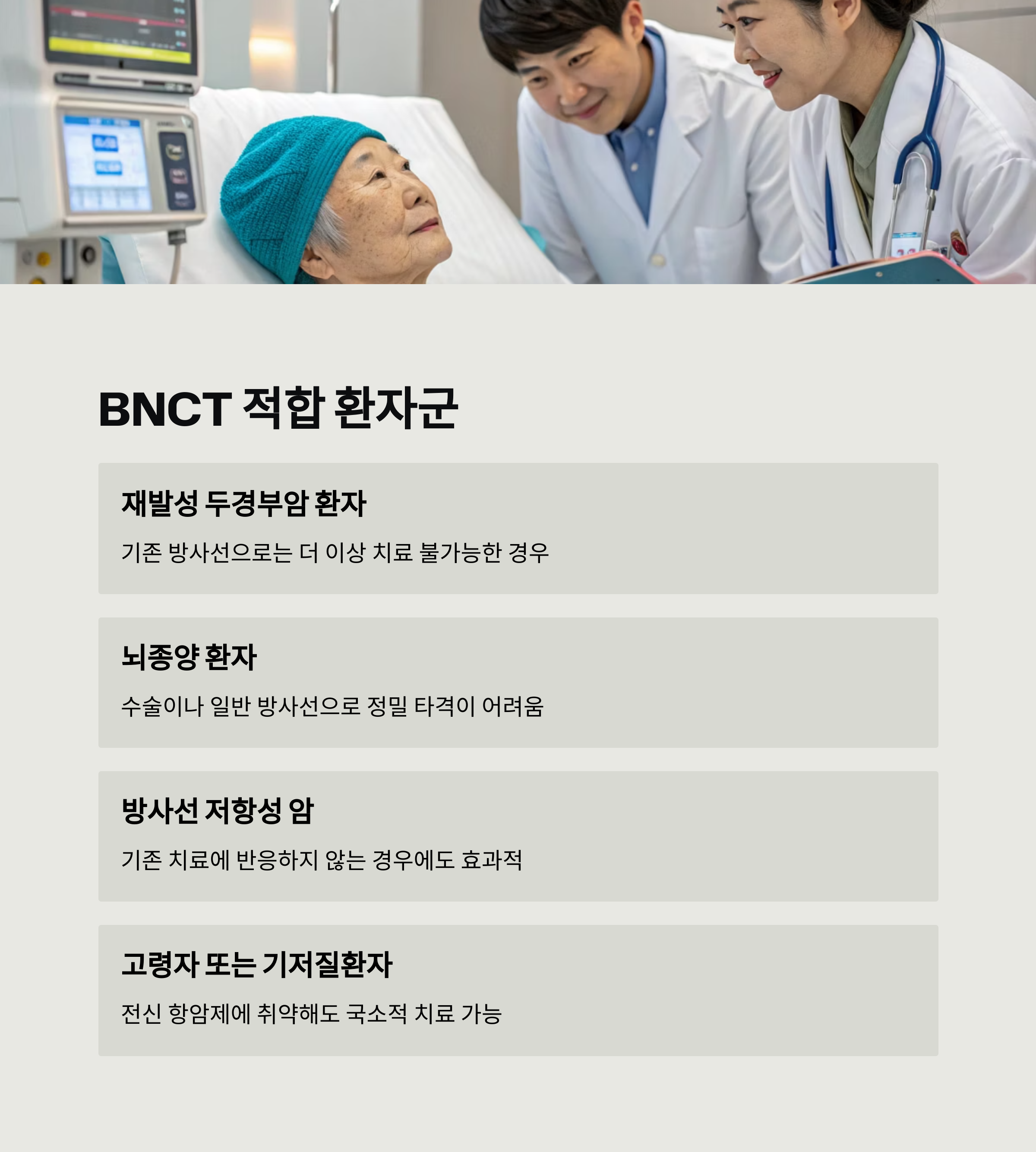 | 방사선 저항성 암 | 기존 치료에 반응하지 않지만 BNCT는 다른 원리로 작용 |