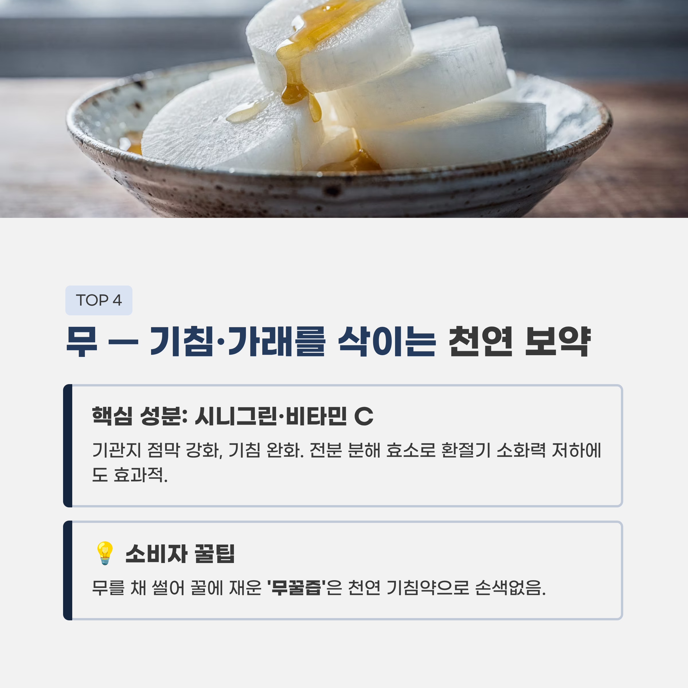 - 소비자 꿀팁: 무를 채 썰어 꿀에 재워 만든 '무청'은 천연 기침약으로 손색이 없습니다.